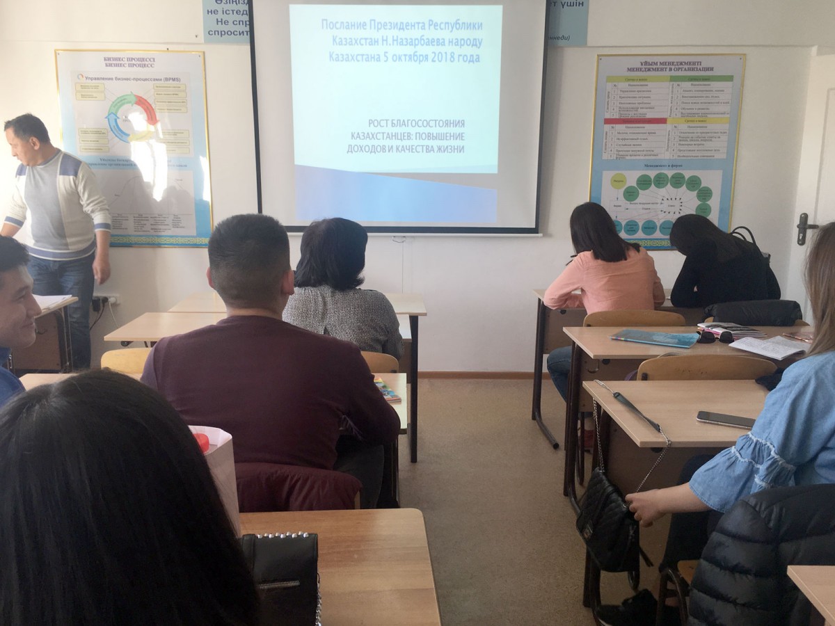 ЖОО табыстылығы бағасының басты критериі оқуды бітірген соң түлектердің жұмыспен қамтамасыз етілуі, көп ақылы жұмысқа орналасулары болып табылады. ЖОО-ны нығайту бойынша саясатты жүргізу керек. Бірінші проректор А.Ж.Исмаилов, оқу және ғылыми жұмыс жөніндегі проректор Қ.Ә.Ахметов, тәрбие ісі жөніндегі проректор Я.Н. Оспанова, ЕАГИ деканы Қ.А.Мамаділ, педагогика кафедрасының меңгерушісі Б.С.Сәрсекеев, заң пәндер кафедрасының меңгерушісі Х.А.Әбишев, экономикалық және математикалық пәндер кафедрасы меңгерушісінің орынбасары Б.Б.Мажитова, ЖІК төрағасы Н.Тырнахан, «Тарих» мамандығының 4-курс студенті А.Домесинова өз сөздерінде Президент айтқан міндеттерді жүзеге асыруда курсты қолдады.