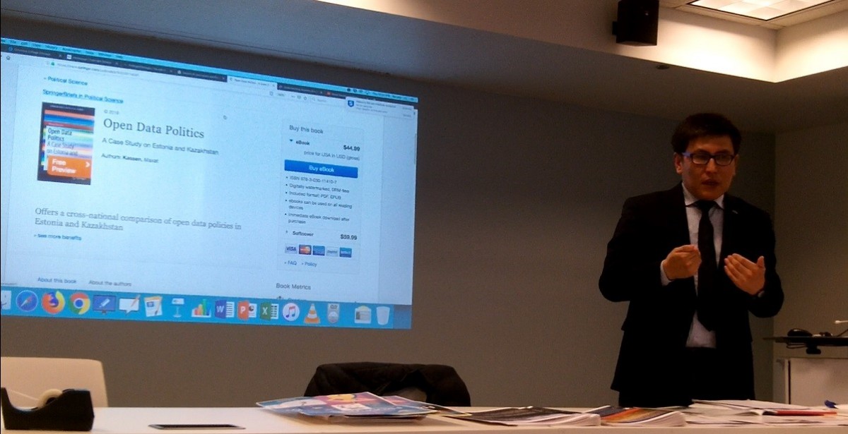 Бұдан басқа 2019 жылдың 4 сәуірінде профессор Мақсат ҚАСЕН сенатор Фулбрайттың атындағы Халықаралық білім беру бағдарламасы қауымдастығының штаб-пәтерінде ресми сөз сөйлеу үшін шақырылды, онда ол осы бағдарламаның түлегі ретінде өзінің ғылыми жетісіктерінің нәтижелерін көрсетті. Сонымен бірге осы іс-шараның аясында “Open Data Politics” (ағылшын тілінен аударғанда “Ашық мәліметтер саясаты ”) кітабының тұсаукесері өтті. Бұл монография беделді ағылшын тілінде шығатын әлемдік ғылыми қоғамдастық қабылдаған Springer (Швейцария) академиялық баспасында жарық көрді. Бұл іс-шараға АҚШ және әлемнің басқа да елдерінен осындай білім беру бағдарламасының профессорлары, докторанттары, түлектері, сонымен бірге американдық ЖОО-ның проректорлары мен декандары шақырылды. Сондай-ақ осы ғылыми сапар аясында АҚШ-тың және шетелдегі саяси оқиғалардың мәселелерін қамтыған жергілікті БАҚ өкілдерімен кездесу өтті.