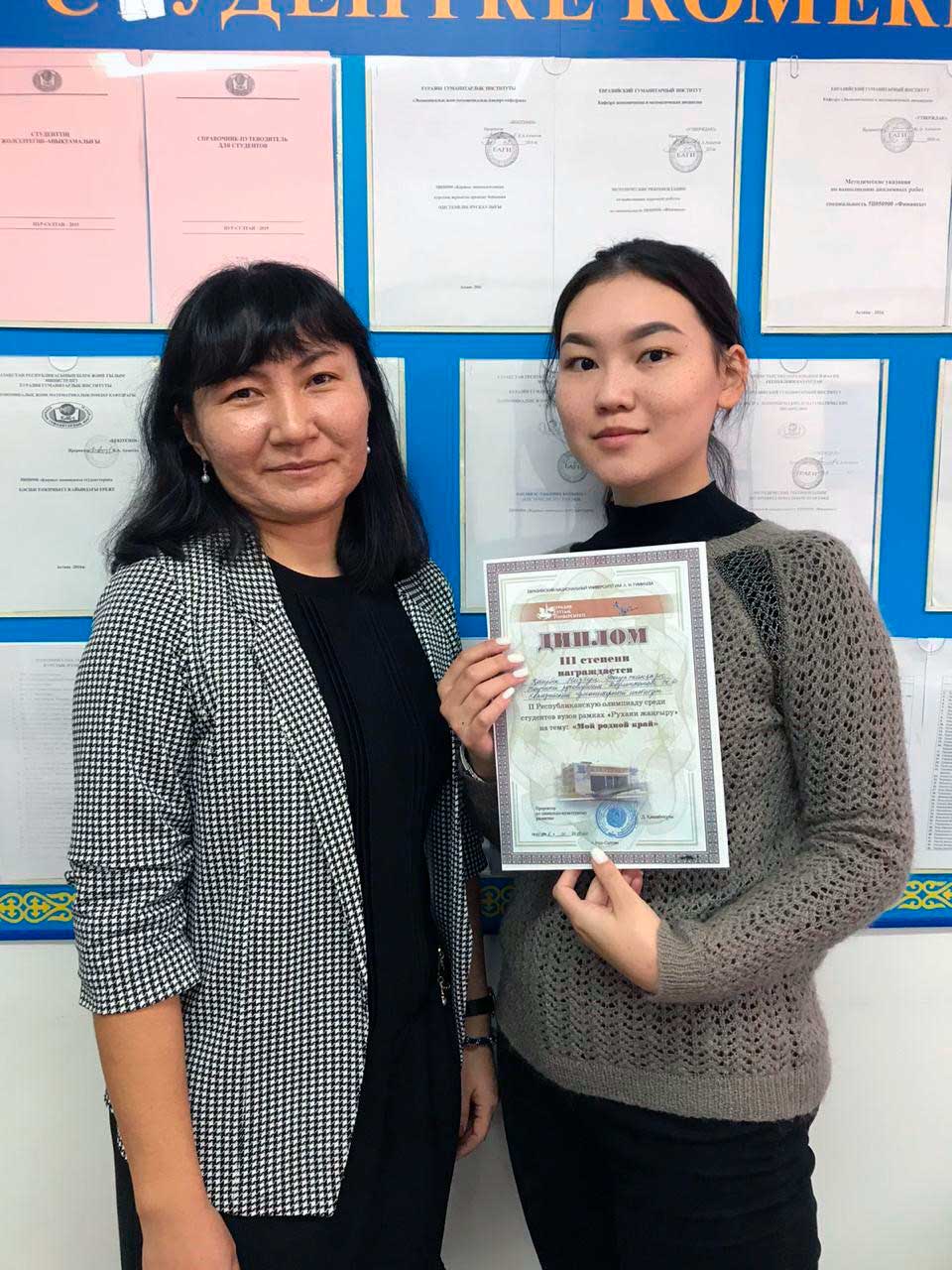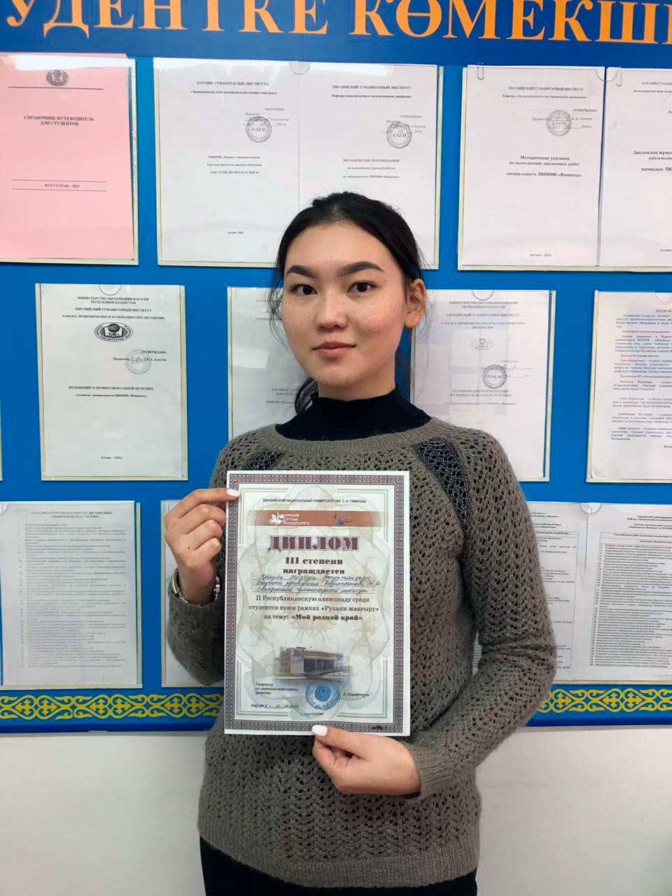 Олимпиада нәтижесі бойынша Қаирбек Н.Б. ІІІ дәрежелі дипломмен марапатталды. Ғылыми жетекшісі аға оқытушы, экономика ғылымдарының магистры Даулетханова Ж.Д.