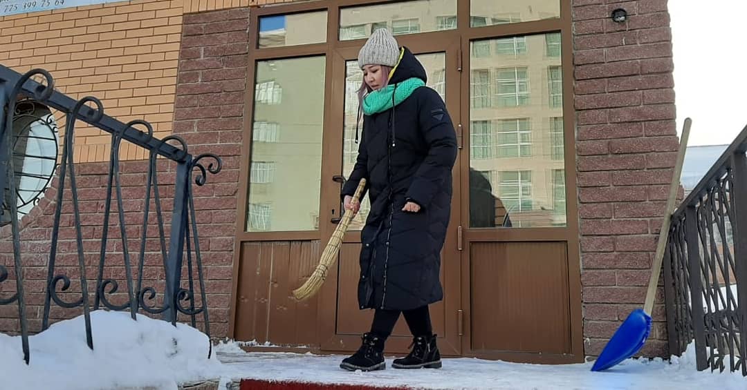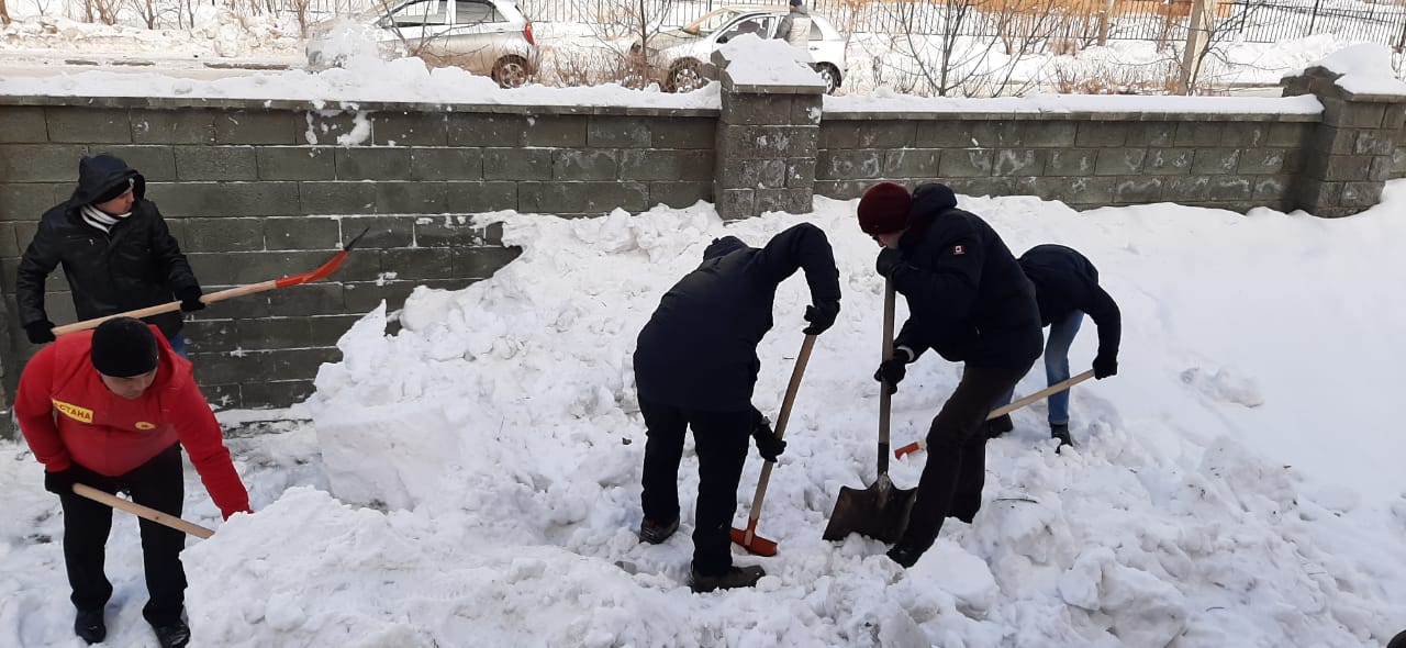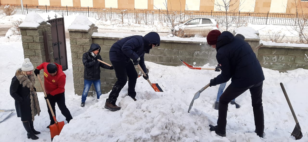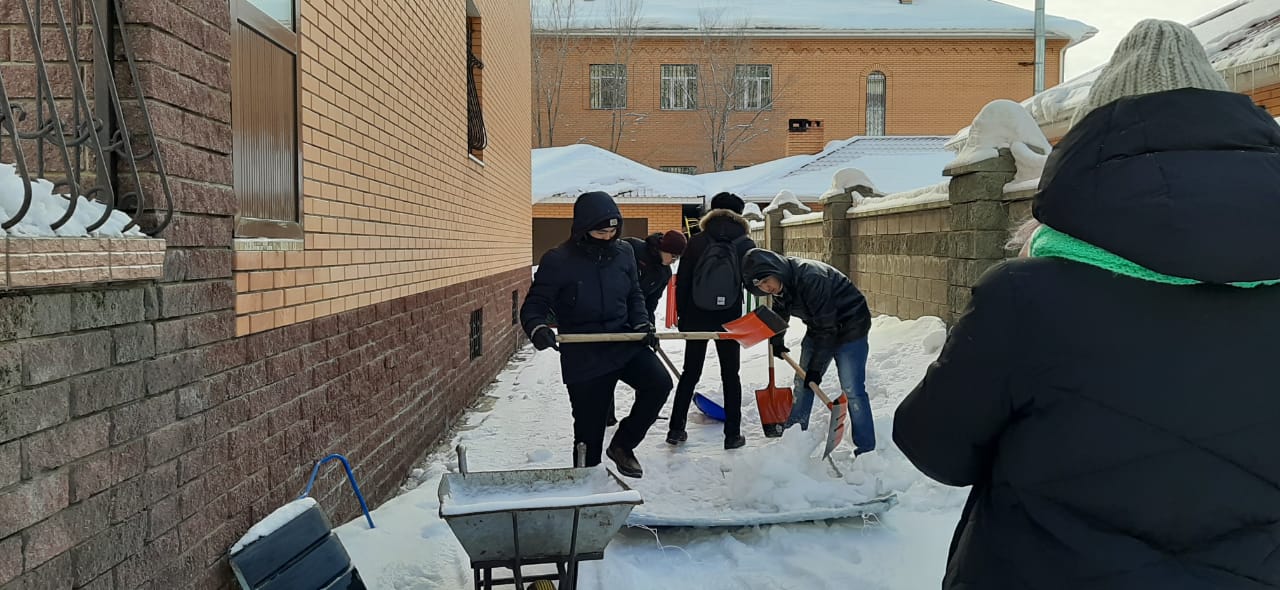Заң пәндері кафедрасының волонтерлік студенттер тобы және “Zhas Qanat” әлеуметтік клубының мүшелері мен бірге, 2020 жылы 11 ақпан күні, “Росток” инклюзивті білім беру орталығын қардан тазалады.