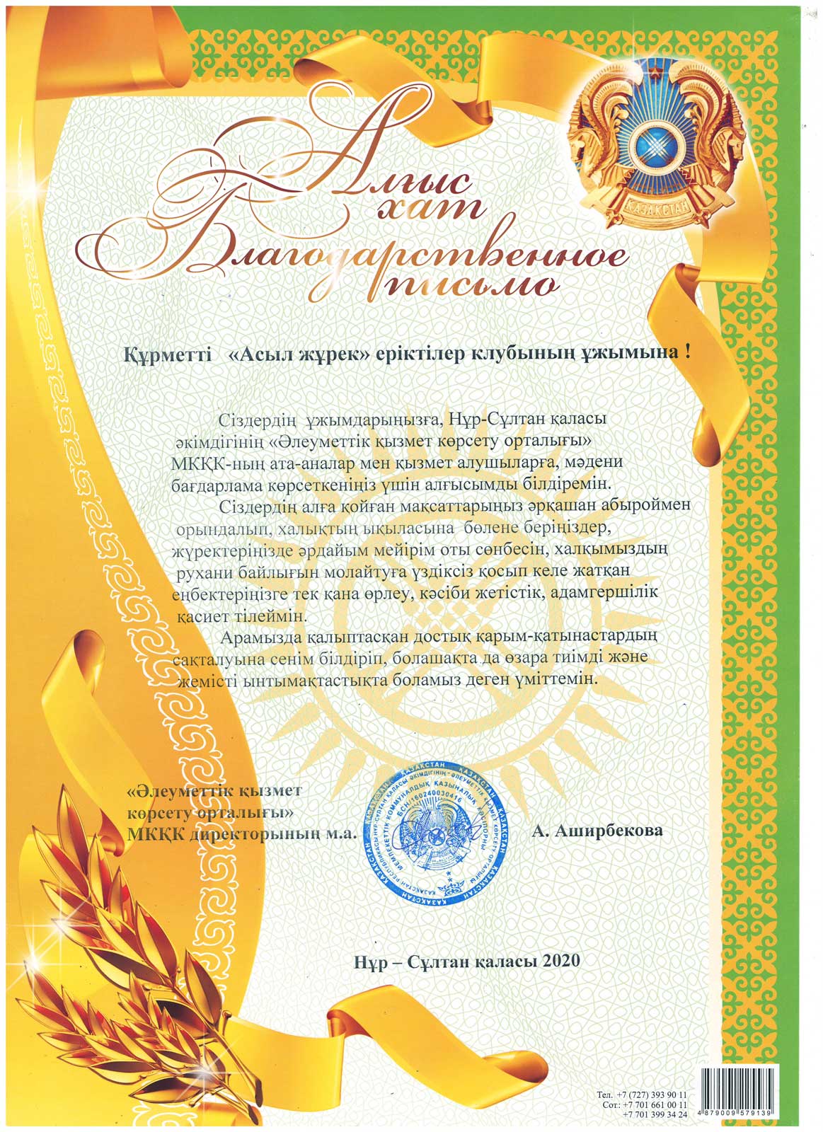 Тренинг соңында «Жанұя» орталығының басшылығы «Асыл жүрек» клубының волонтерлеріне алғыс хат тапсырды.
