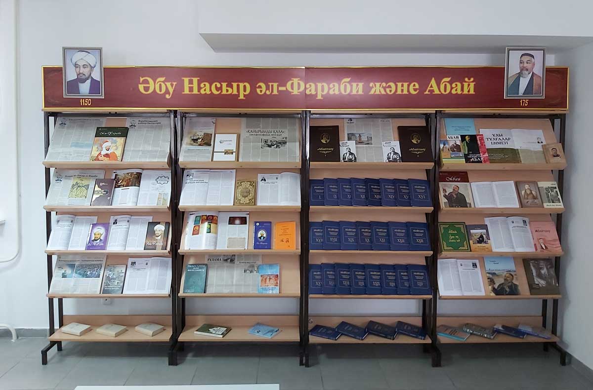 Кітапхана қорынан кітап көрмесіне данышпан-ғұлама Әбу Насыр әл-Фарабидің рухани келбетін ашатын зерттеулер қойылды; әлемдік қоғамдық-философиялық ойдың дамуындағы әл-Фарабидің маңыздылығы мен оның мәдениет тарихындағы орны туралы ғалымдардың (Гафуров Б.Г., Касымжанов А.Х. Әл-Фараби мәдениет тарихында; Касымжанов А.Х. әл-Фараби; Көбесов әл-Фараби мен Абайды қатарға оқығанда; Қожақ Ж.Ә. әл-Фараби; Құл-Мұхаммед М. Әл-Фараби. Тарих, тұлға, уақыт) пікірлері көрсетілді.