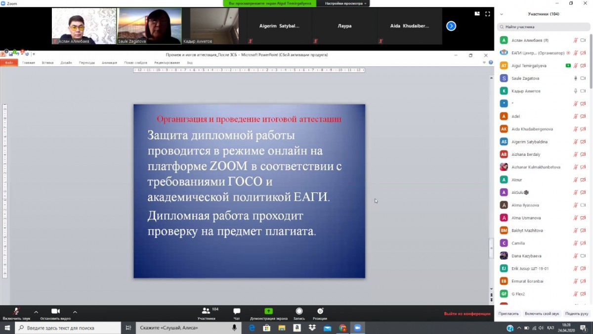 Вебинар барысында студенттермен аралық және қорытынды сессиялардың форматы талқыланды. «Аударма ісі» мамандығы бойынша бітіруші курс студенттері ағымдағы сессияны қашықтықтан тапсыру тәжірибесімен бөлісті.
