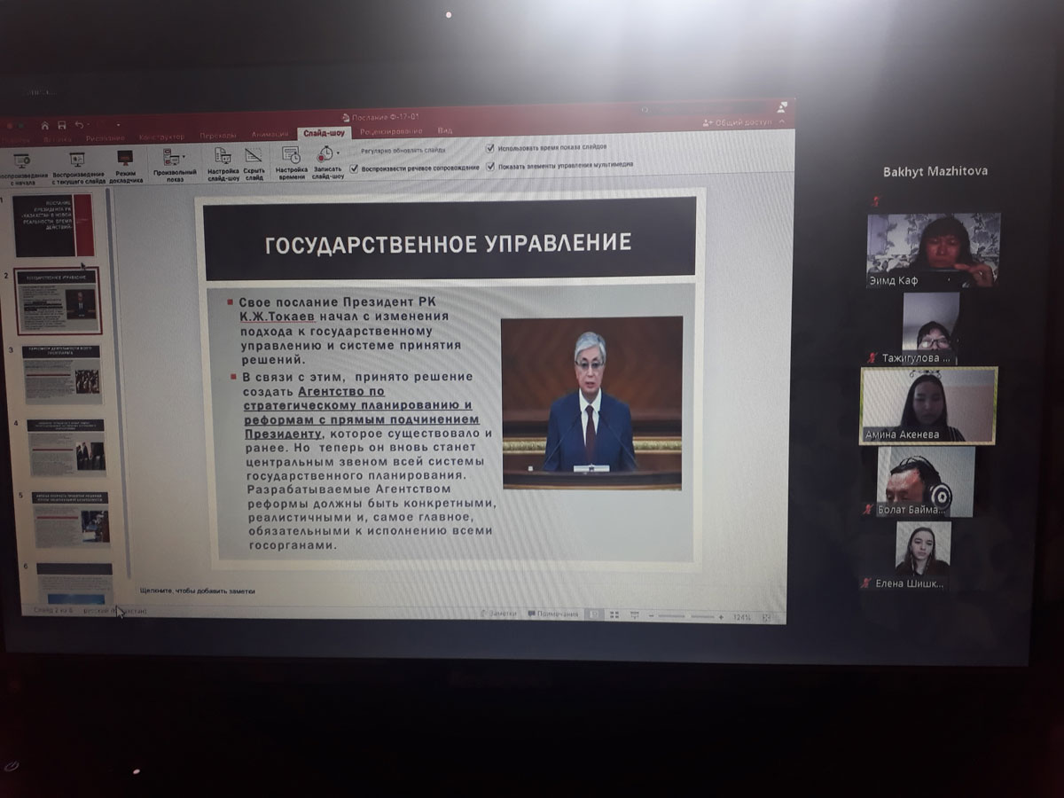 Сонымен қатар «Қаржы» мамандығының 4 курс студенттері Акенова А. « Мемлекеттік басқарудың жаңа үлгісі » және Жалмышева Д. « Қолжетімді әрі сапалы білім » бөліміне, 3 курс студенті Штеккен Н. « Жаңа жағдайдағы экономикалық даму », 2 курс студенттері Токова А. « Азаматтардың әлеуметтік әл-ауқаты – басты басымдық » Смағұл Қ. « Цифрландыру – барлық реформаның негізгі элементі » бөлімдері бойынша баяндамалар дайындап өз ойларымен бөлісті.