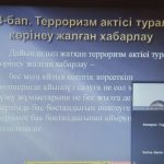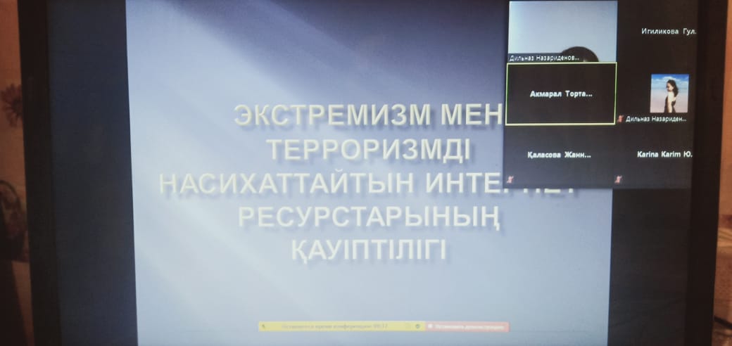 2020 жылдың 23 қазан күні «Құқықтану» білім беру бағдарламасының ЮҚ-20-01 тобының студенттері мен топ кураторы, заң пәндері кафедрасының аға оқытушысы, з.ғ.м. Тортаева А.Э. «Экстремизм мен терроризмді насихаттайтын интернет ресурстарының қауіптілігі» тақырыбында кураторлық сағат өткізді. Іс-шараның мақсаты студенттерге экстремизм, терроризм, радикализм терминдеріне түсінік беру, Қазақстан Республикасындағы лаңкестікпен қарсы күрестің құқықтық негіздері, қазіргі таңдағы ахуал жайы жөнінде мағлұмат беру болды. Кездесу барысында студенттерге терроризм мен экстремизм туралы түсіндірме бейнероликтер көрсетілді, ҚР қылмыстық кодексінің 273-бабы «Терроризм актiсi туралы көрiнеу жалған хабарлау» туралы айтылып, пікір алмасу болды.