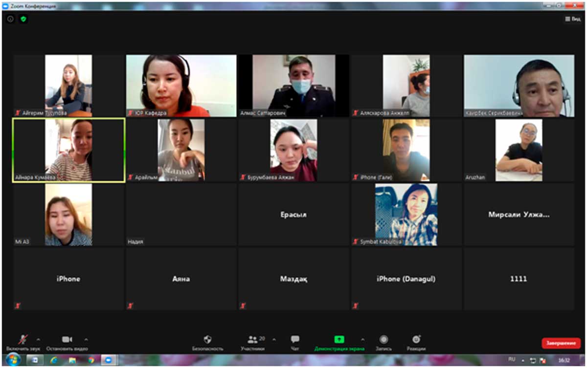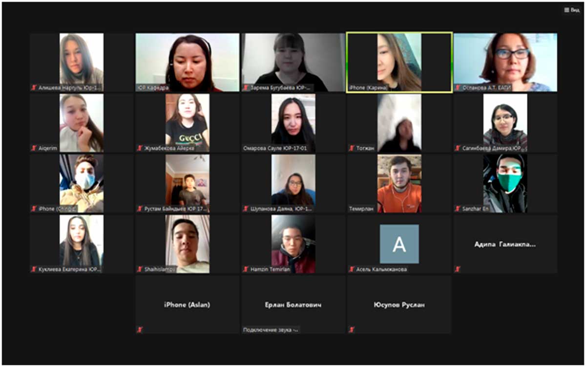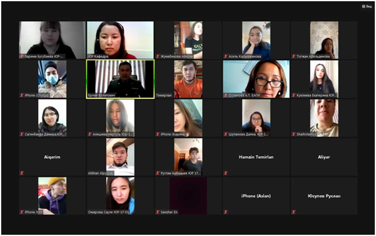 2020 жылдың 29-30 қазанында “Zoom” платформасында “Алматы” ауданы Полиция басқармасының Кадр саясаты бөлімінің бастығы полиция подполковнигі А.С. Жаппаровпен, сондай-ақ “Алматы” ауданы Полиция басқармасы бастығының орынбасары полиция подполковнигі Е.Б. Әбішевпен онлайн-кездесу өтті. Атаулы іс-шара 5В030100 – «Құқықтану» мамандығының бітіруші курс студенттерімен өткізілді. Бұл онлайн-кездесудің негізгі мақсаты ҚР Ішкі істер органдарына жұмысқа орналастыру, сондай-ақ қызметтің негізгі аспектілерімен таныстыру болды. Студенттер өздерін қызықтырған сұрақтарын қоя отырып, аталған іс-шараға үлкен қызығушылықпен қатысты. Еуразия гуманитарлық институтының студенттері мен заң пәндері кафедрасы Нұр-сұлтан қаласы “Алматы” ауданының Полиция басқармасына аталған іс-шараны ұйымдастырып, өткізгеніне үлкен алғыстарын білдірді.