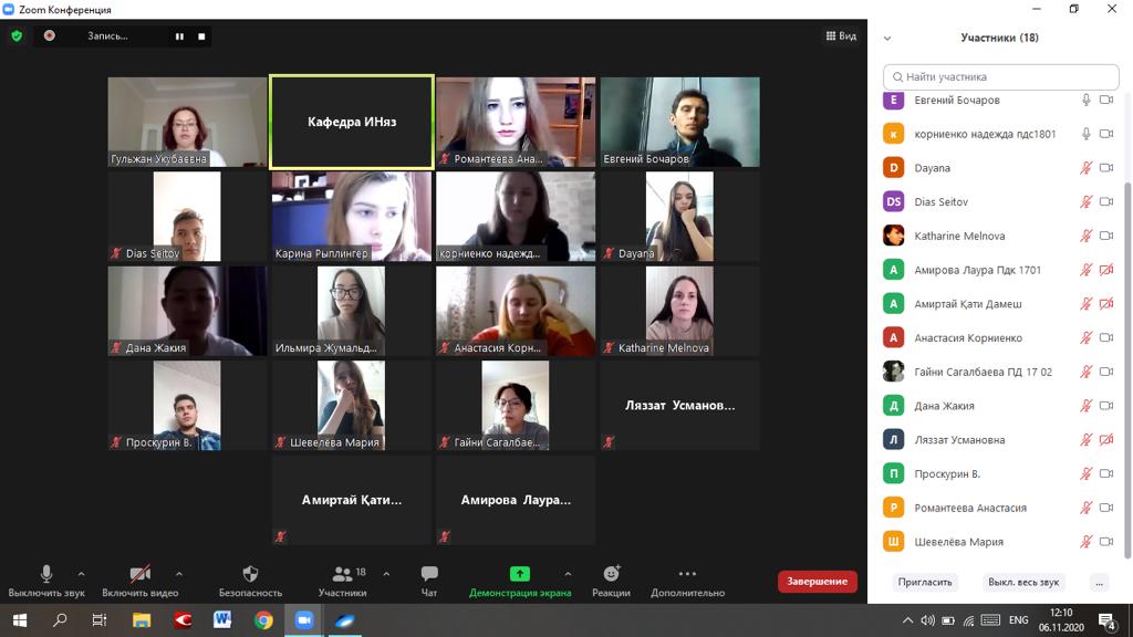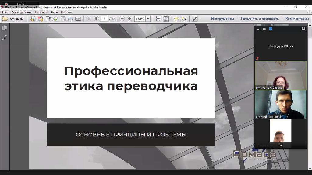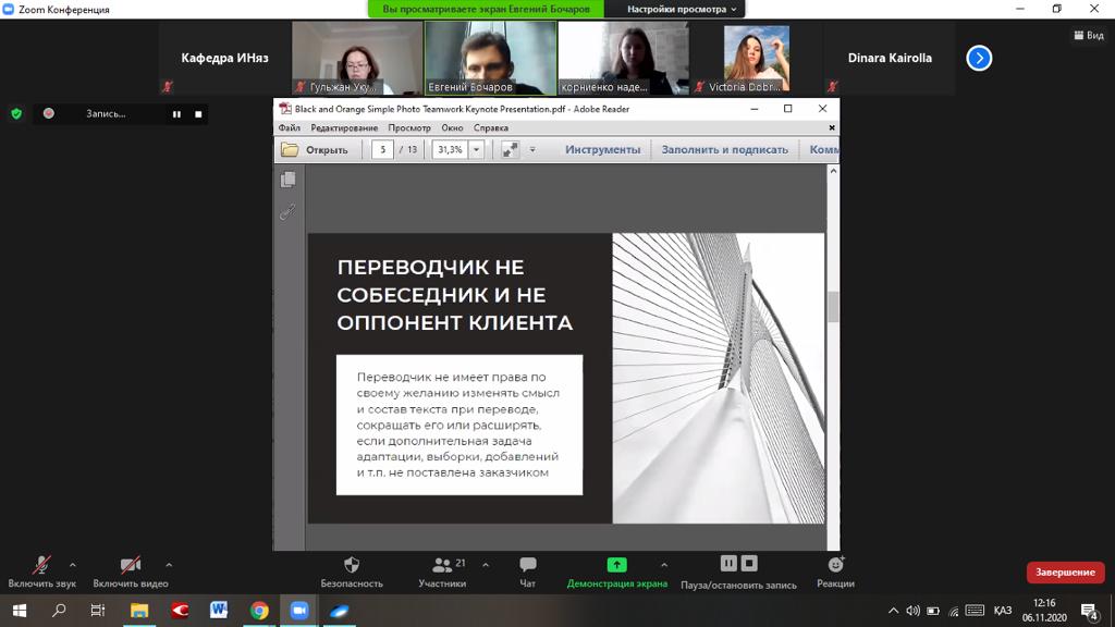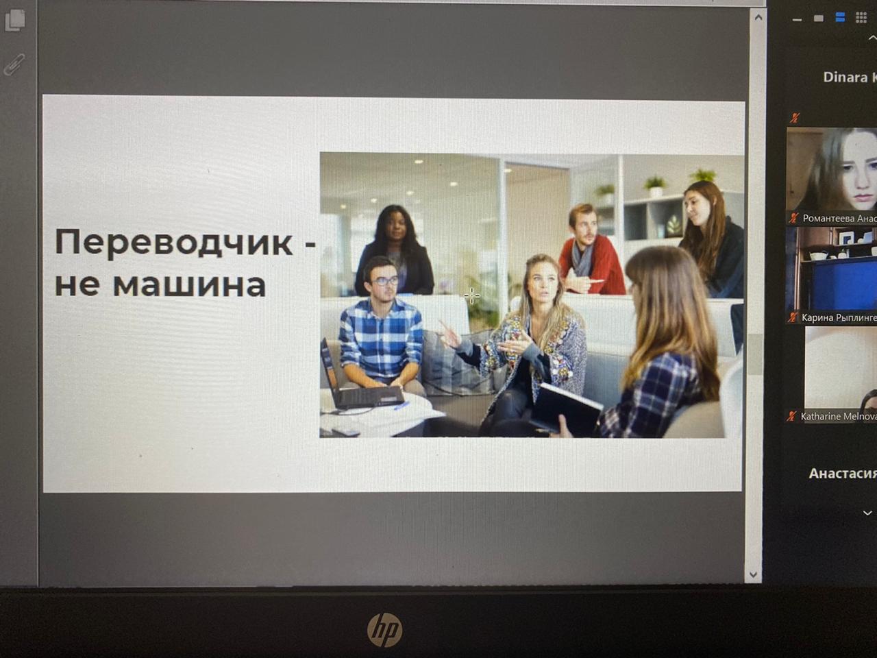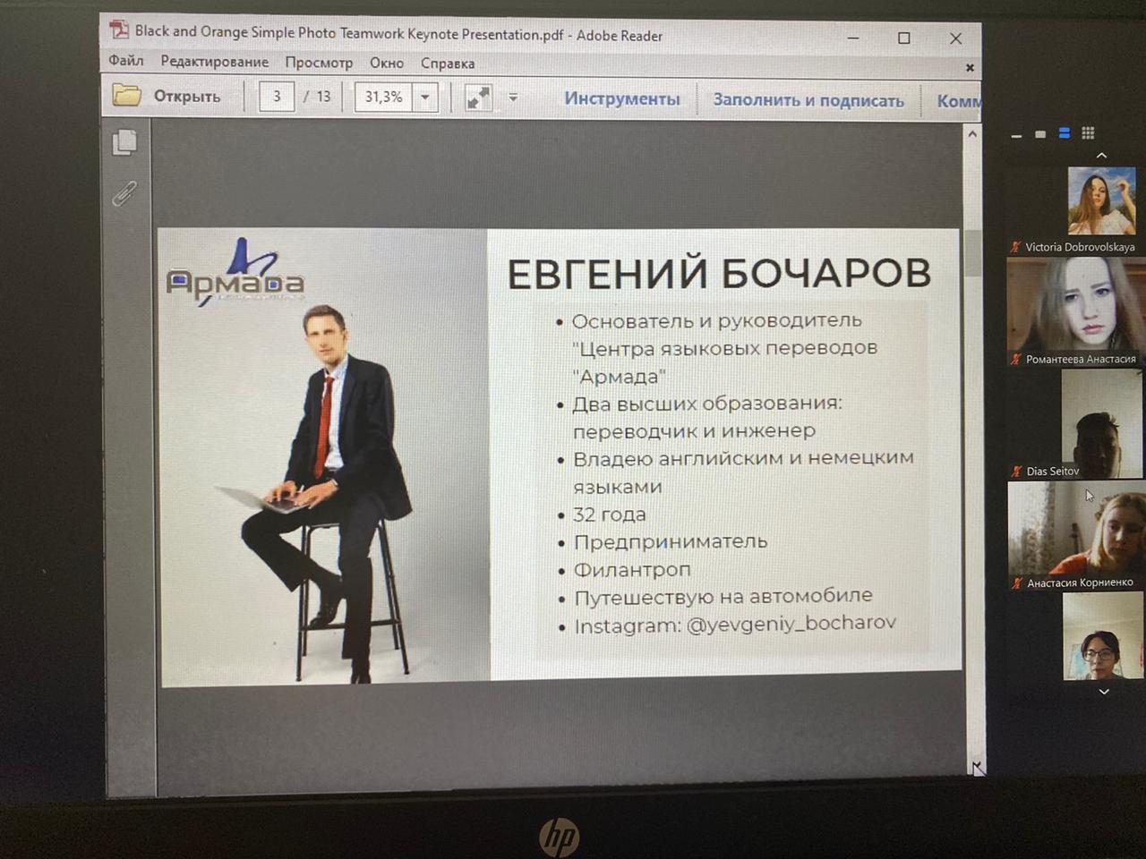 2020 жылдың 6 қарашасында «Аударма ісі» білім беру бағдарламасының түлектеріне арналған «Аудармашының кәсіби этикасы: негізгі қағидаттары мен мәселелері» тақырыбында онлайн мастер-класс өтті. Шеберлік сабағын тілдік аудармалар орталығының директоры, ЕАГИ түлектері қауымдастығының мүшесі, жұмыс беруші Бочаров Евгений (2010 жылғы түлек) өткізді. Мастер-класс интерактивті режимде өтті. Студенттер аудармашы жұмысына қатысты көптеген құнды кеңестер алды. Алынған ақпарат үлкен қызығушылық тудырды.