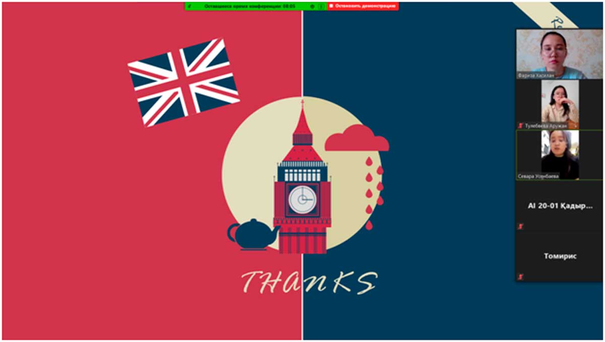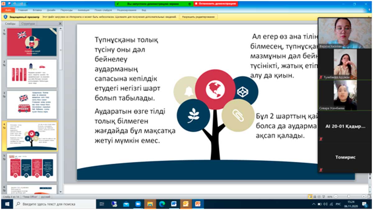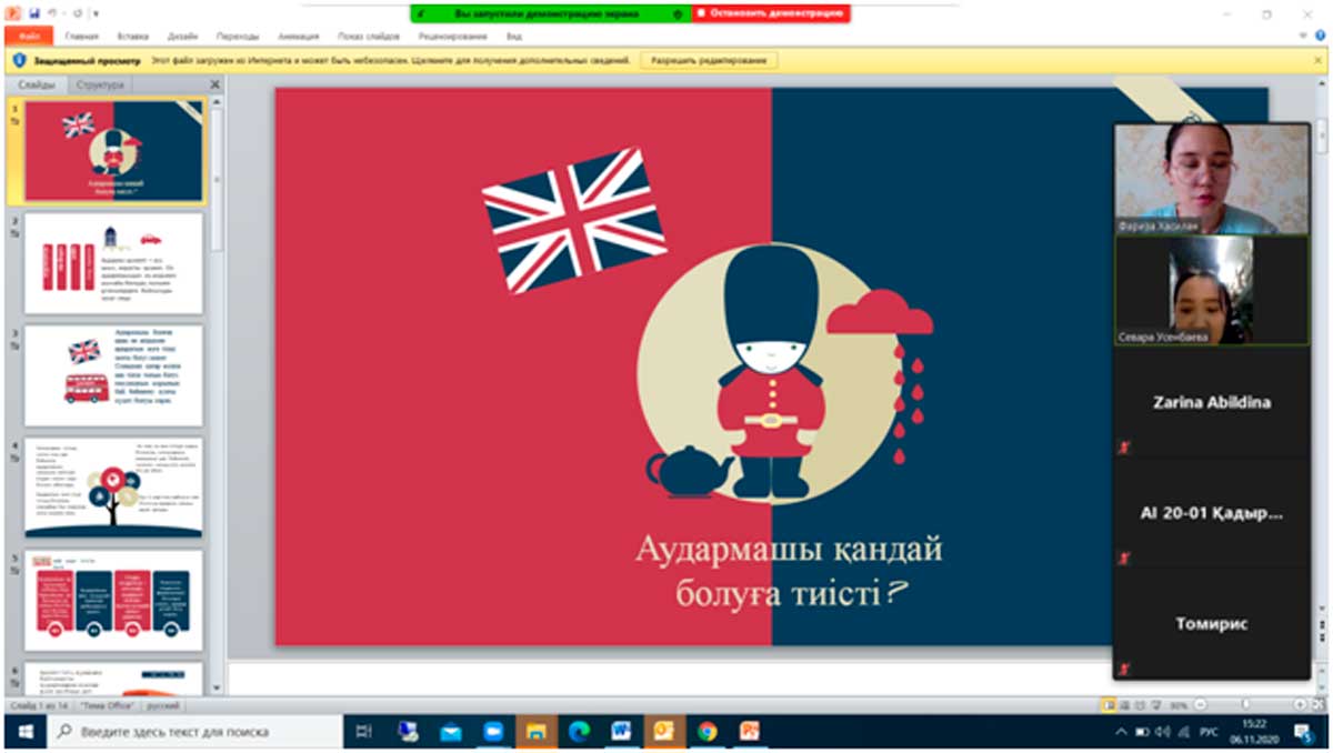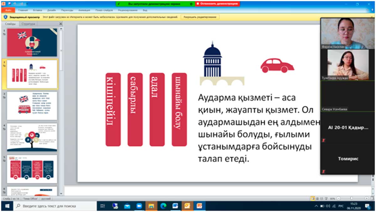 Қараша айының 6 жұлдызында «Аударма ісі» мамандығының 1 курс студенттерімен «Аудармашы қандай болуға тиісті» тақырыбында топ кураторы Хасилан Фариза кураторлық сағат өткізді. Кураторлық сағатта AI-20-01 академиялық тобының студенттері аталған тақырыпқа байланысты өз ойларын ортаға салды. Топ старостасы Үсенбаева Севара аудармашыға қойылатын талаптар мен аударма қызметі тақырыбында презентация қорғады, топ белсендісі Әтен Аружан баяндама жасады.