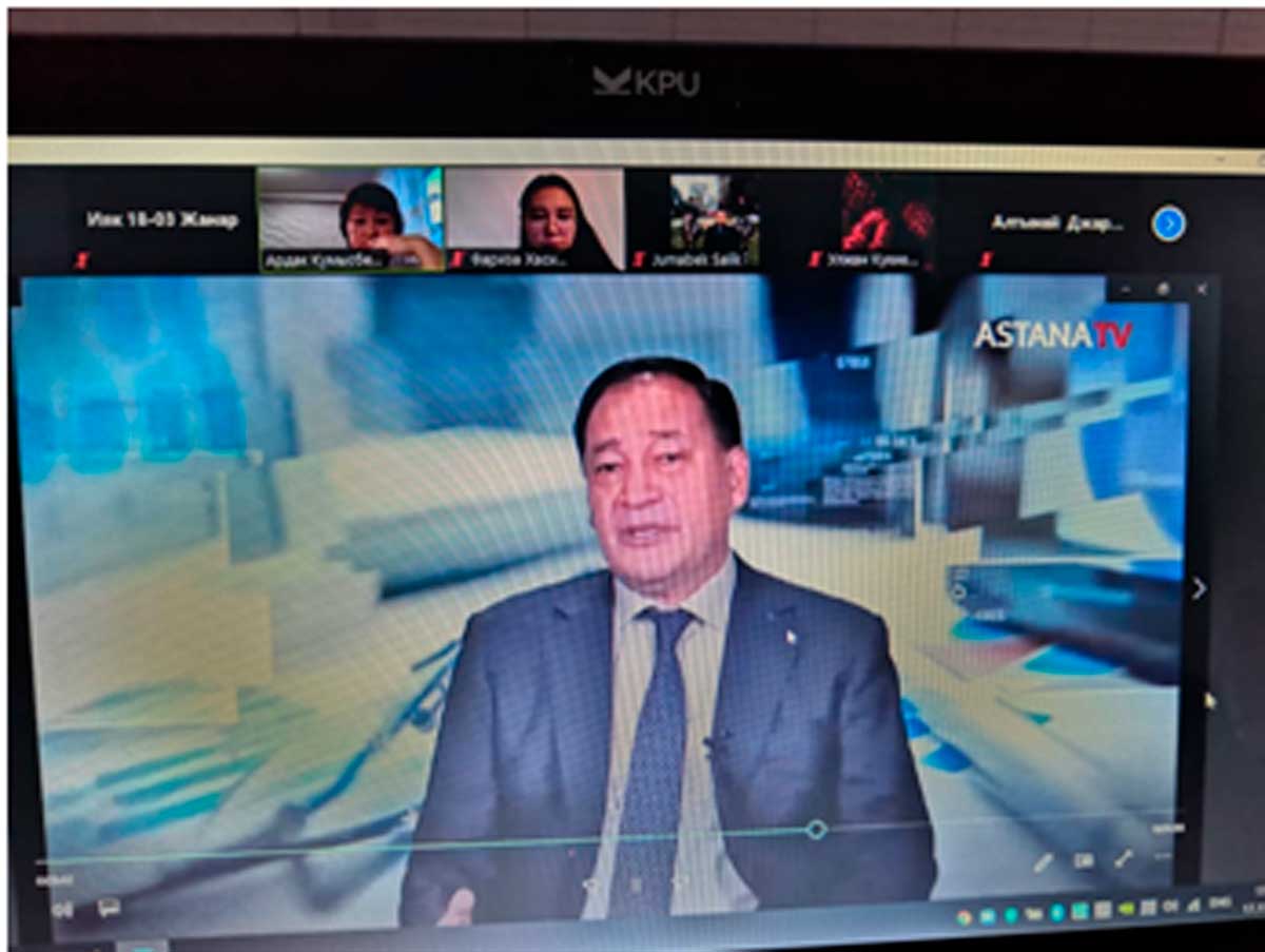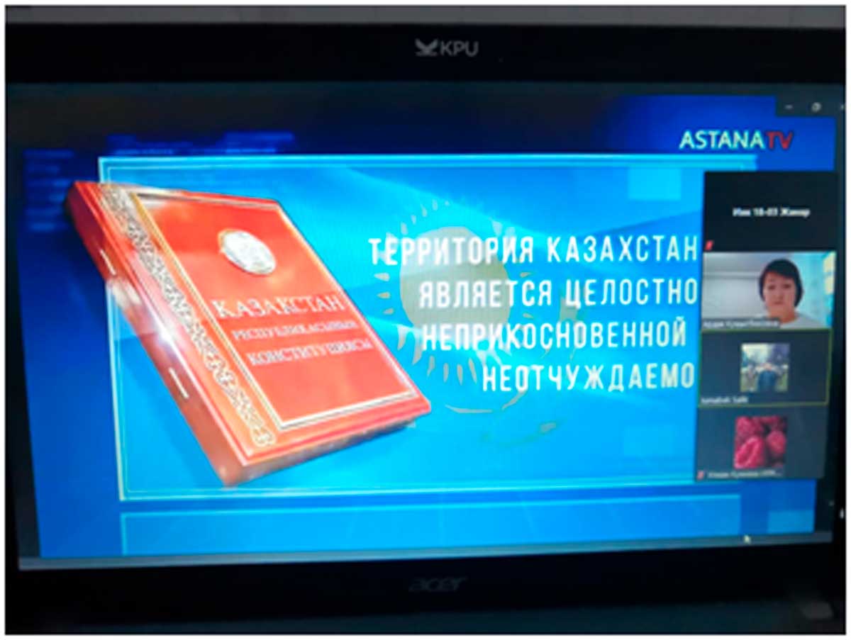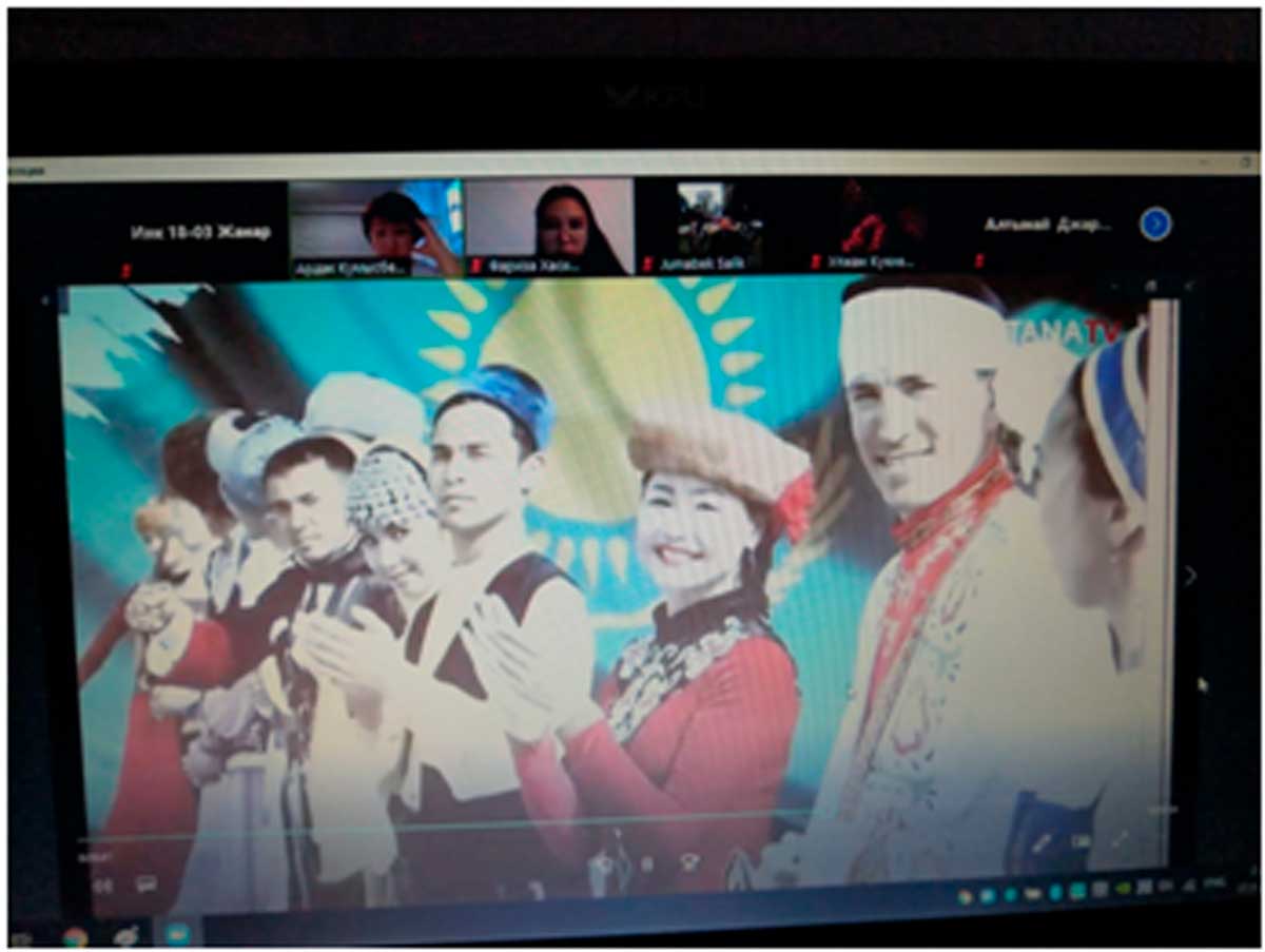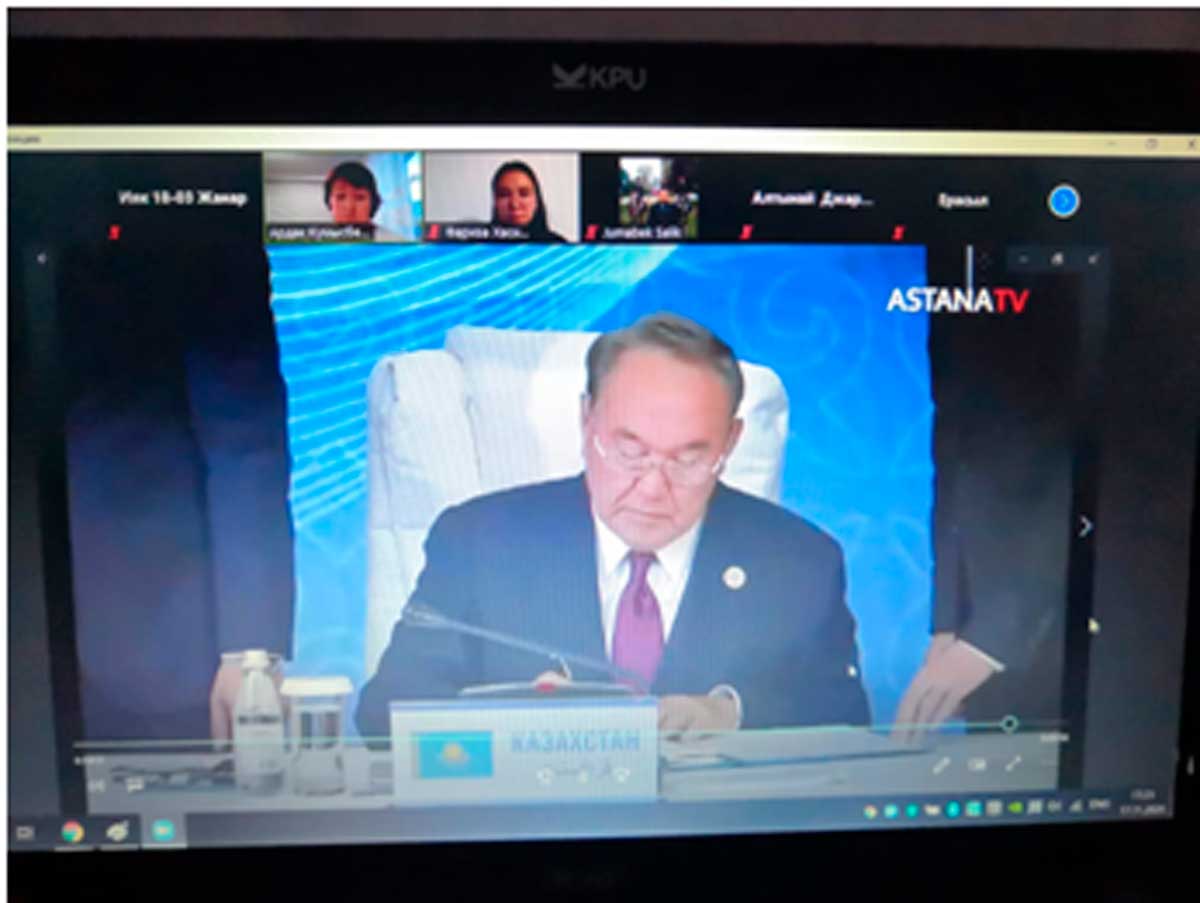 Студенттердің назарына «Тәуелсіздік дәуірі» атты деректі бейнефильм ұсынылды. Кураторлық сағатты мерекелік құттықтау сөзімен ИЯК-18-03 тобының студенті Ерден Ерасыл жалғастырып, қазақ күйлерінен попурри орындады.