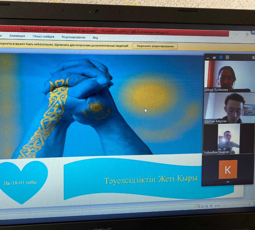 2020 жылдың 19 қараша күні «Тарих» мамандығының ИК-18-01 тобының кураторы А.З. Еслямова Тұңғыш Президент күнін мерекелеуді ұйымдастыру және «Тәуелсіздіктің 7 қыры» деректі фильмдер топтамасын талқылау бойынша ZOOM платформасында онлайн кураторлық сағат өткізді. Шараға педагогика кафедрасының профессорлық-оқытушылық құрамы, студенттер қатысты. Кураторлық сағат барысында 2019 жылы маусымда өткен «Кемеңгерліктің 30 жылы» халықаралық конференциясында тұңғыш Президент Н.Назарбаевтың айтқан 7 бастамасы негізінде түсірілген фильмдер талқыланды. Аға оқытушы А.З.Еслямова деректі фильмдегі негізгі тұжырымдар мен ойларды білім алушылармен талқылап, негізгі идеясын тыңдаушыларға жеткізді.