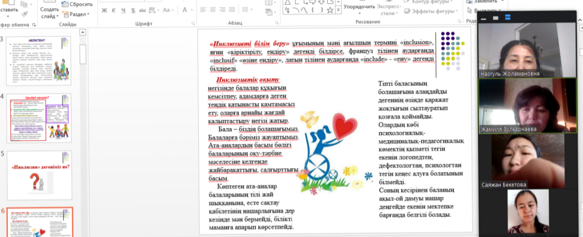 2020 жылдың 30 қараша күні педагогика кафедрасының аға оқытушысы Болатбекова Назгуль Жоламановна академиялық ұтқырлық аясында Ш.Уәлиханов атындағы  Көкшетау мемлекеттік университетінің «Мектепке дейінгі  оқыту және тәрбиелеу» білім беру бадарламасының топтарымен «Инклюзивтік білім беру жөніндегі құзыретті кадрларды дайындау» модулі негізінде кезекті онлайн-дәріс сабағын өткізді. Онлайн-сабақ диалогтық формада, рефлексиялық деңгейде өтті.