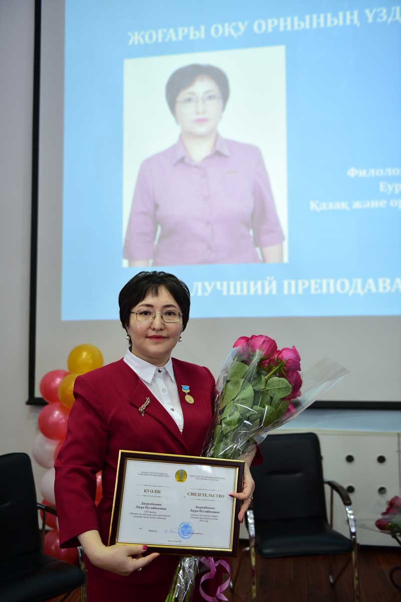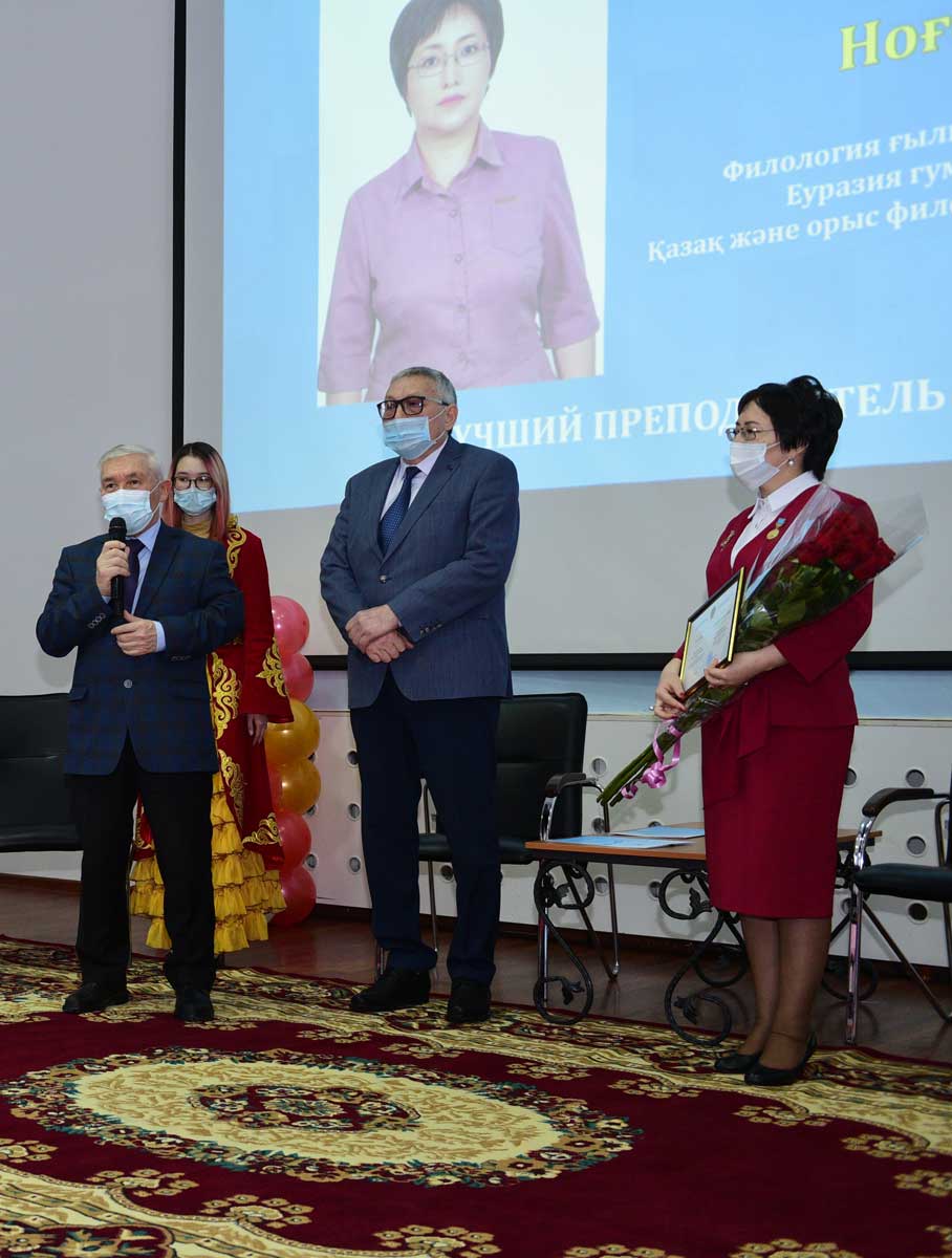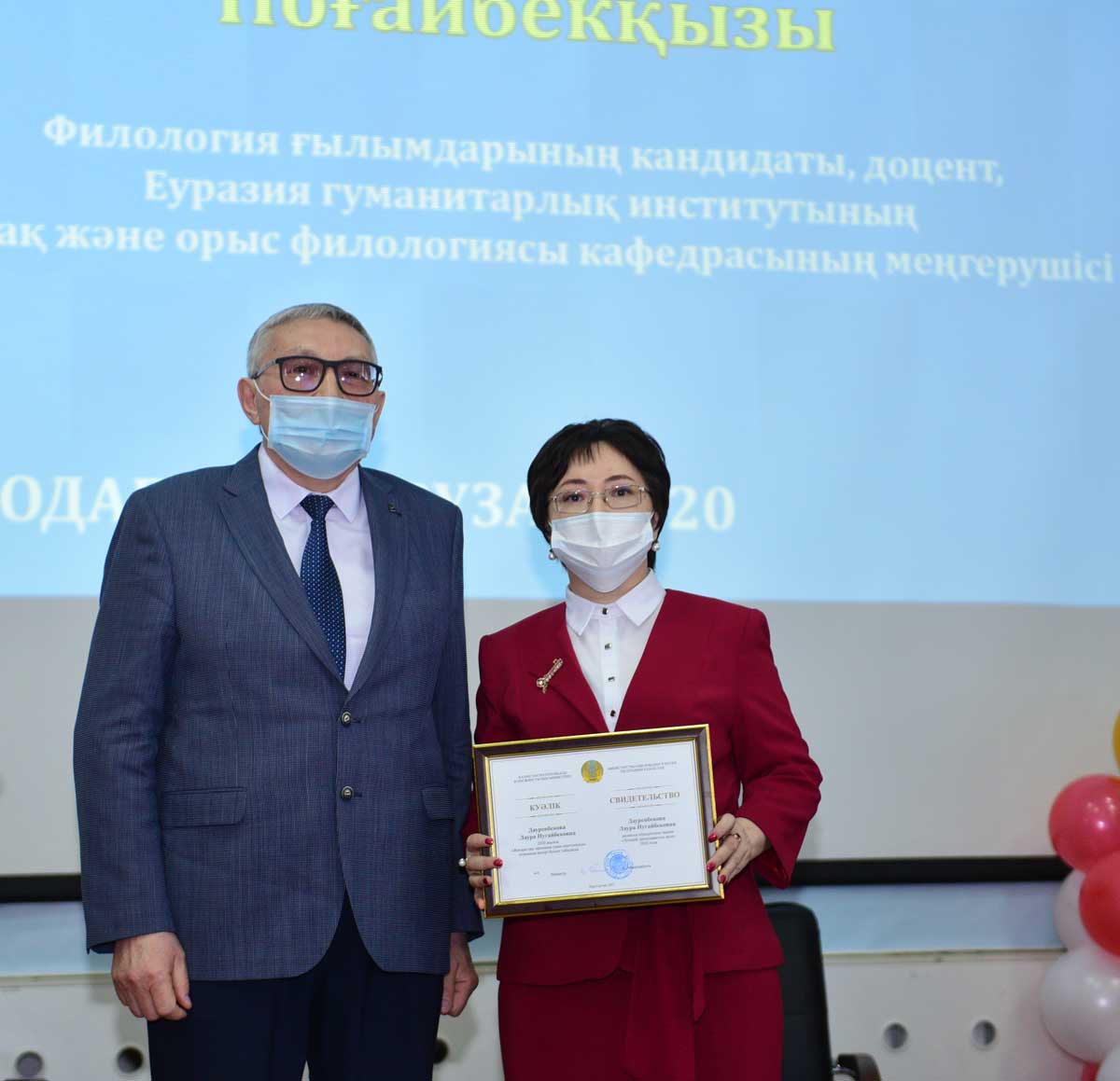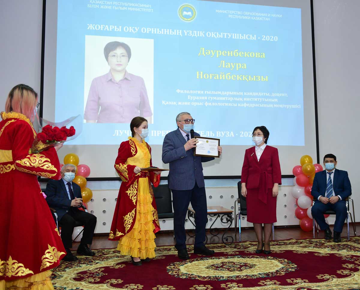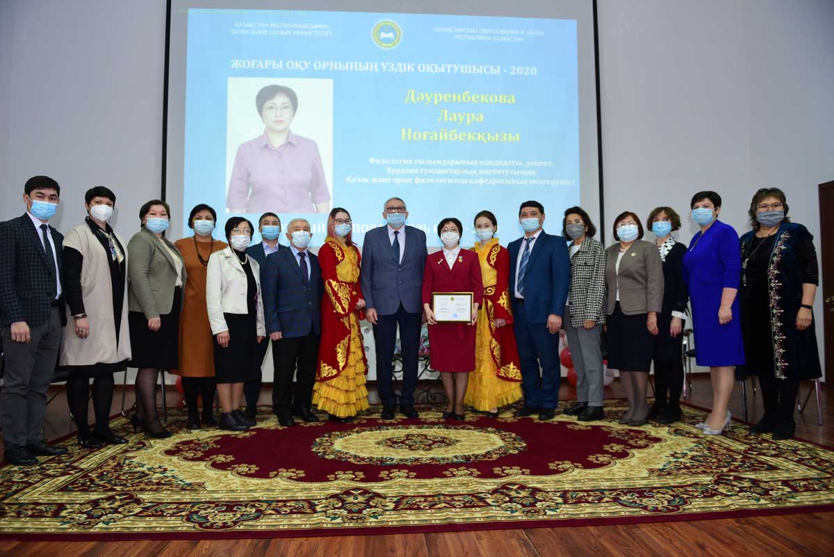 Бұдан әрі институтта «ЖОО-ның 2020 жылғы үздік оқытушысы» байқауының жеңімпазы – қазақ және орыс филологиясы кафедрасының меңгерушісі, ф.ғ.к., доцент Л.Н. Дәуренбековаға құрмет көрсетілді.