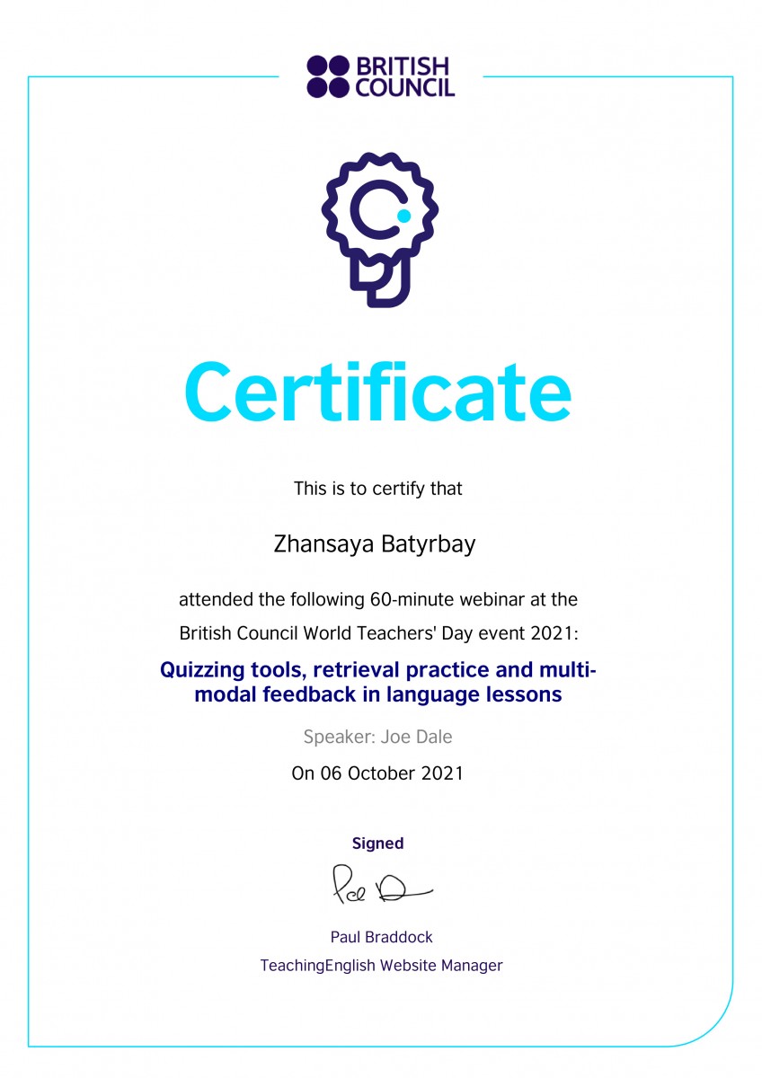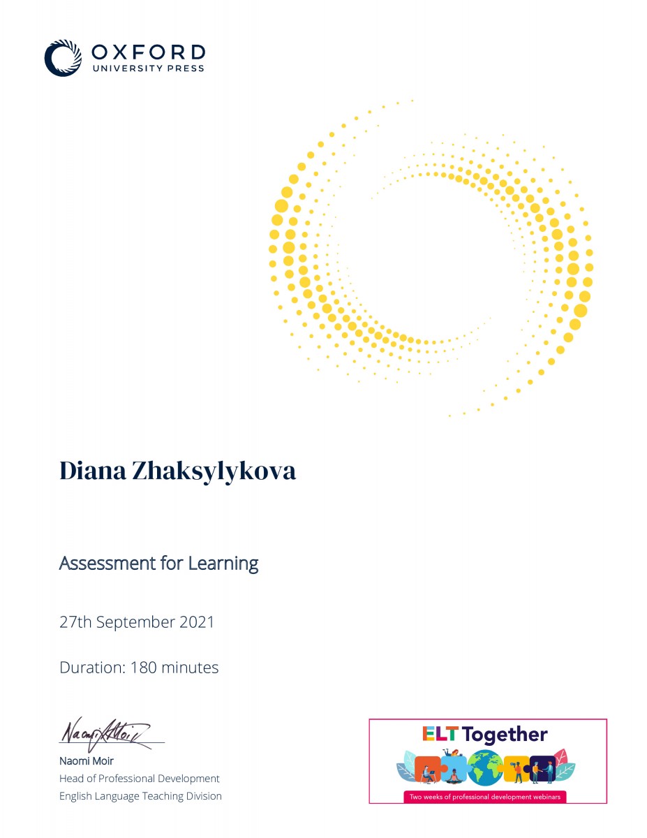 2021 жылдың, 27 қыркүйек пен 8 қазан аралығында шет елтілдері кафедрасының ИЯк-18-02 топ студенттері, аға оқытушы Сарсенова Анар Мәдібекқызының жетекшілігімен келесі вебинарларға қатысты. Oxford University Press, Tony Green мен Paul Woodfall өткізген – “Assessment for learning”, “Pronunciation”, “Literature and Extensive Reading ” және British Council, Joe Dale жүргізген – “Quizzing tools, retrieval practice and multi-modal feedback in language lessons” атты вебинарларға қатысты. XXI-ғасырдың талабына сай студенттер тек институт қабырғасында ғана емес халықаралық білімге ұмтылуда. Вебинарлар соңында студенттерге сертификаттар берілді.