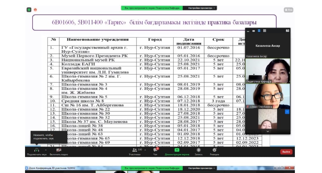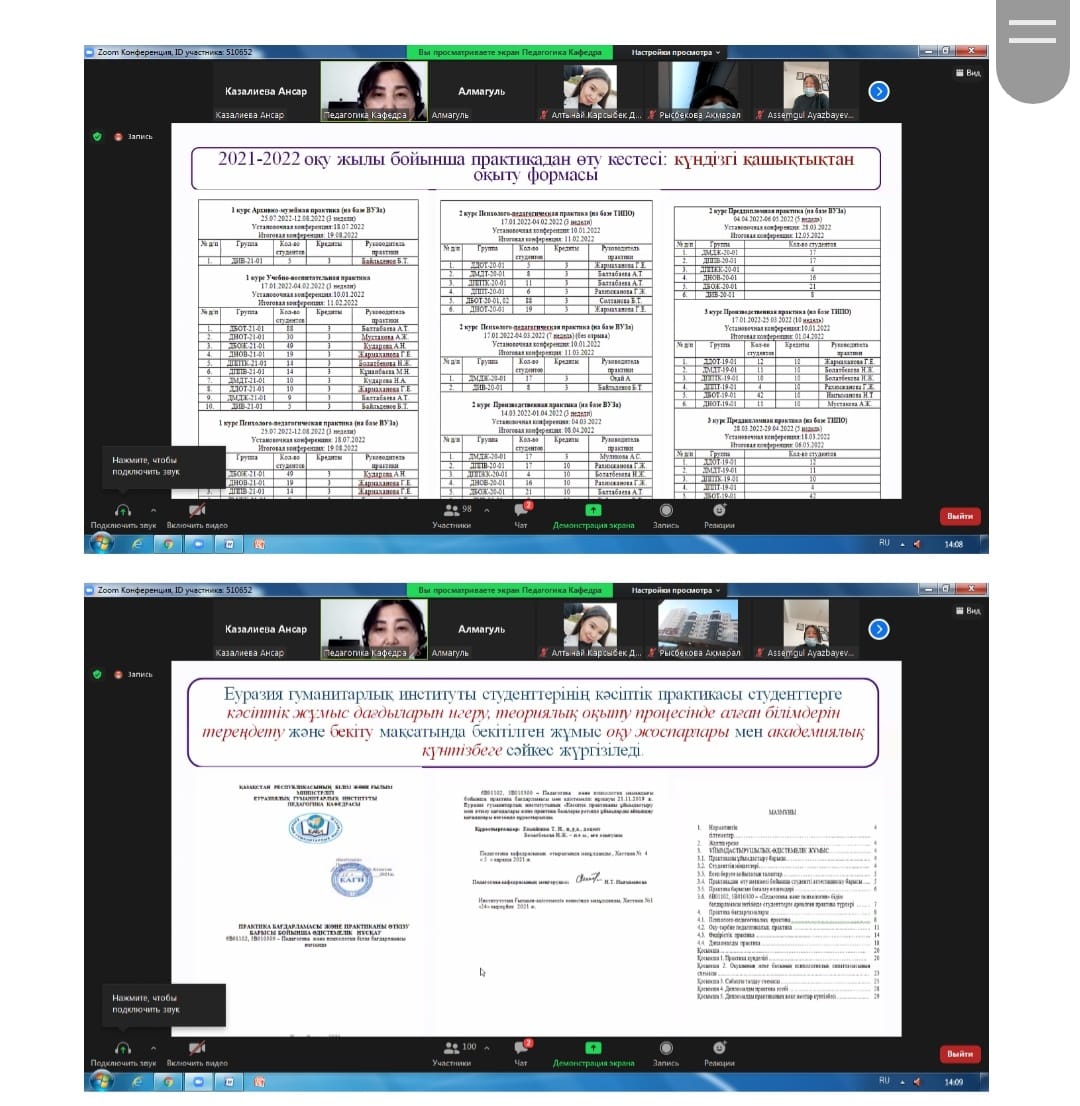 2021 жылғы 8 желтоқсанда педагогика кафедрасының білім беру бағдарламалары бойынша күндізгі және қашықтықтан білім беру технологияларын қолдана отырып күндізгі бөлімдері студенттерімен практика барысы бойынша конференция ұйымдастырылды. Конференцияға ЕАГИ-дің мансап және кәсіптік практика үйлестірушісі Оспанова А.Т. мен кафедраның профессорлар-оқытушылар құрамы қатысты.