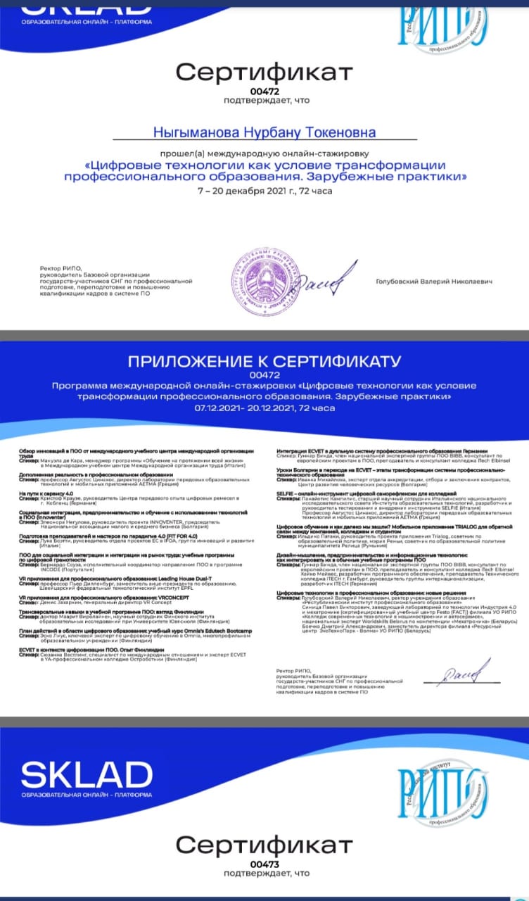 2021 жылдың 7-20 желтоқсан аралығында педагогика кафедрасының оқытушылары (құрамында 16 адам) республикалық кәсіптік білім беру институты ұйымдастырған SKLAD білім беру онлайн-платформасында «Цифрлық технологиялар кәсіптік білім беруді трансформациялаудың шарты ретінде. Шетелдік тәжірибе» (72 сағат) атты халықаралық онлайн-тағылымдамадан өтті. Бағдарлама Германия мен Финляндия сияқты шет елдердің цифрлық білім беру тәжірибесі мен тәжірибесін қарастыруды қамтыды. Барлық оқытушыларға сертификаттар берілді.