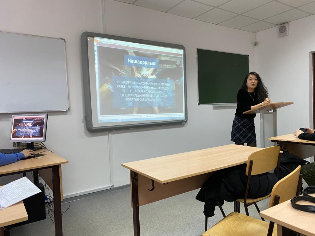 2022 жылдың 14 ақпан күні шетел тілдері кафедрасының кураторы Б.Ш. Кадрина «Аударма ісі» білім беру бағдарламасының 3 курс студенттеріне (АІ-19-01 академиялық тобы) «Нашақорлықты алдын алу» тақырыбында дөңгелек үстел ұйымдастырды. Студенттер «Нашақорлыққа салынған жасөспірімдер» бейнеролигін көріп, есірткі заттарын қолданудың денсаулыққа зиянды әсері мәселелерін талқылауға белсенді қатысты.