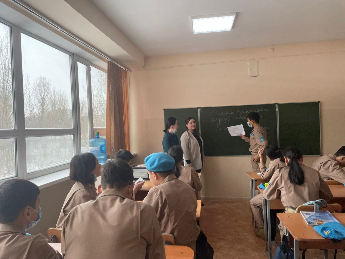 2022 жылдың 15 ақпанында өндірістік тәжірибе аясында «Шетел тілі: екі шетел тілі» білім беру бағдарламасының 4 курс студенттері Жаксылыкова Диана, Батырбай Жансая және Армановна Дильда Нұр-Сұлтан қ., С.Мәуленов атындағы №37 мектеп-лицейінің 9 сынып оқушыларына Ауғанстаннан кеңес әскерлерінің шығарылуының аяқталуына арналған еске алу күніне байланысты интерактивті түрде сынып сағатын өткізді.