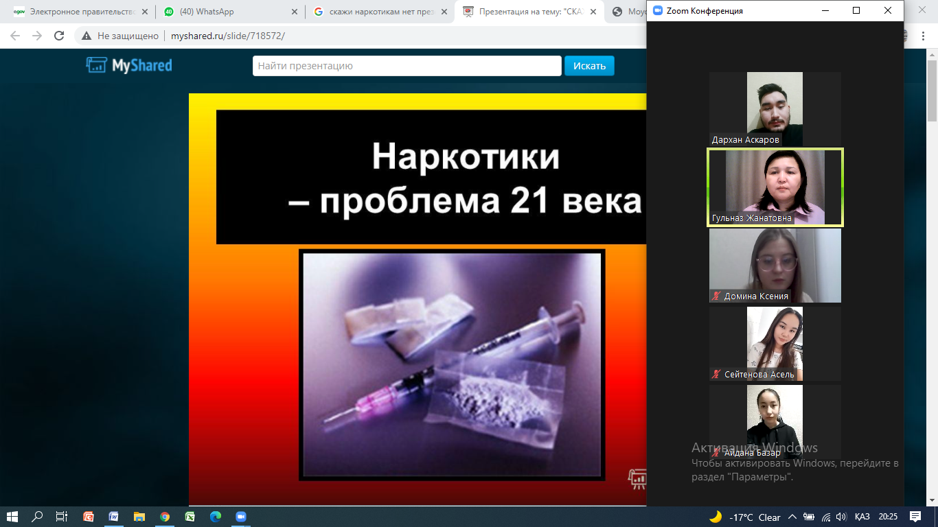 2022 жылдың 16 наурызында педагогика кафедрасының кураторы Г.Ж. Рахимжанова ПП-21-01 (6В01102 – «Педагогика және психология» білім беру бағдарламасы) академиялық тобының студенттеріне ZOOM форматында «Есірткі – ХХІ ғасыр мәселесі» атты кураторлық сағат өткізді. Іс-шараның мақсаты – зиянды әдеттермен күресуге бағытталған мінез-құлық мәдениетін қалыптастыру, нашақорлықтан зардап шегетін адамдарға қатысты жағымсыз ұстанымды өзгерту.
