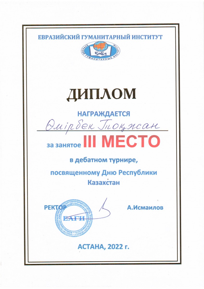 «Линкольн-Дуглас» форматында турнирдің үздік төрешісі болып «Құқықтану» білім беру бағдарламасының студенті Салимжуаров Ғани анықталды (ЮР-20-01 академиялық тобы).