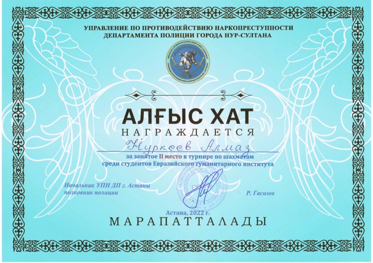 2022 жылғы 30 қарашада Еуразия гуманитарлық институтында Астана қаласы Полиция департаментінің Есірткі қылмысына қарсы іс-қимыл басқармасымен бірлесіп шахматтан турнир өтті. Турнирге қатысушылар алдында тәрбие жұмысы жөніндегі проректор, п.ғ.к., профессор Оспанова Ярослава Николаевна, ЖІК төрағасы Әбілдина Әйгерім және Студенттер Парламентінің спорттық фракциясының жетекшісі, Ф-21-01 академиялық тобының студенті Нұркеев Алмаз құттықтау сөз сөйлеп, шахмат турнирлерін өткізу біздің институттың дәстүрі болып табылатынын және шахматшылардың спорттық шеберлігін жетілдіруге ықпал ететінін атап өтті.