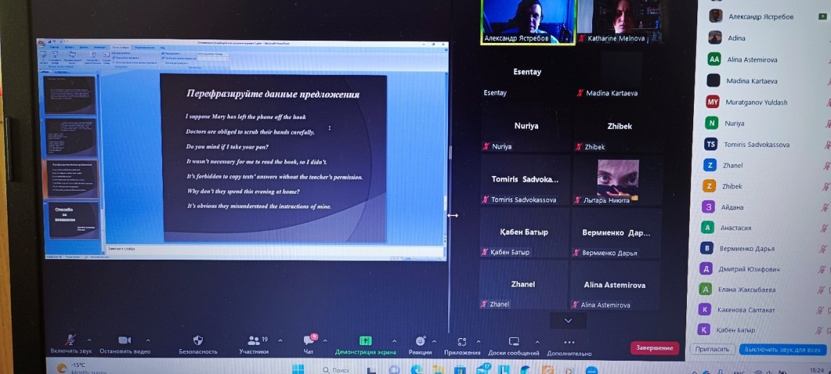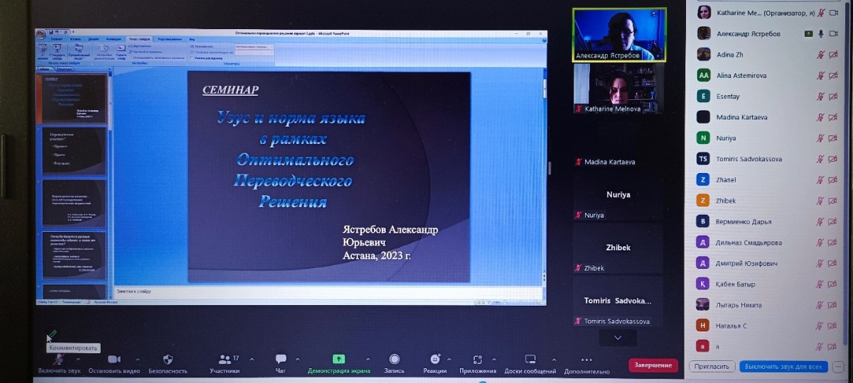 2023 жылғы 26 қаңтарда ПД-21-01 (2 курс, «Аударма ісі» білім беру бағдарламасы) тобының студенттері үшін оқу практикасы шеңберінде «Оңтайлы аударма шешімі шеңберіндегі узус және тіл нормасы» тақырыбында вебинар ұйымдастырылды, оның лекторы жұмыс беруші, «Лексикон-НС» ЖШС директоры А.Ю. Ястребов болды. Студенттер ақпаратты тыңдап, өлеңдердің аудармасы туралы өз пікірлерімен бөлісті, ағылшын тіліндегі сөйлемдерді парафразалауда өз күштерін сынап көрді. Қорытындылай келе, вебинарға қатысушылар синхронды аударма мәселелері және синхронды аудармашылардың алдында тұрған қиындықтар туралы пікірталасқа қатысты.