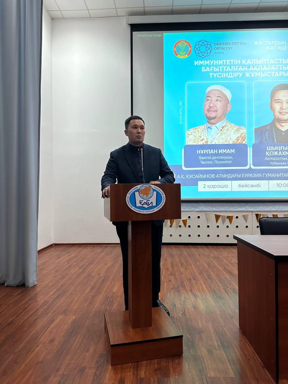 2 ноября 2023 года в Евразийском гуманитарном институте имени А.К. Кусаинова состоялась информационно – разъяснительная встреча нового формата представителей Центра изучения религий при поддержке Управления по делам религий: главного имама мечети Ырыскелді Қажы Асанова Нурлана Байжигитовича, члена информационно-разъяснительной группы в сфере религии г. Астаны Кожахметова Чингисхана со студентами института, направленная на формирование иммунитета молодежи к нетрадиционной идеологии.