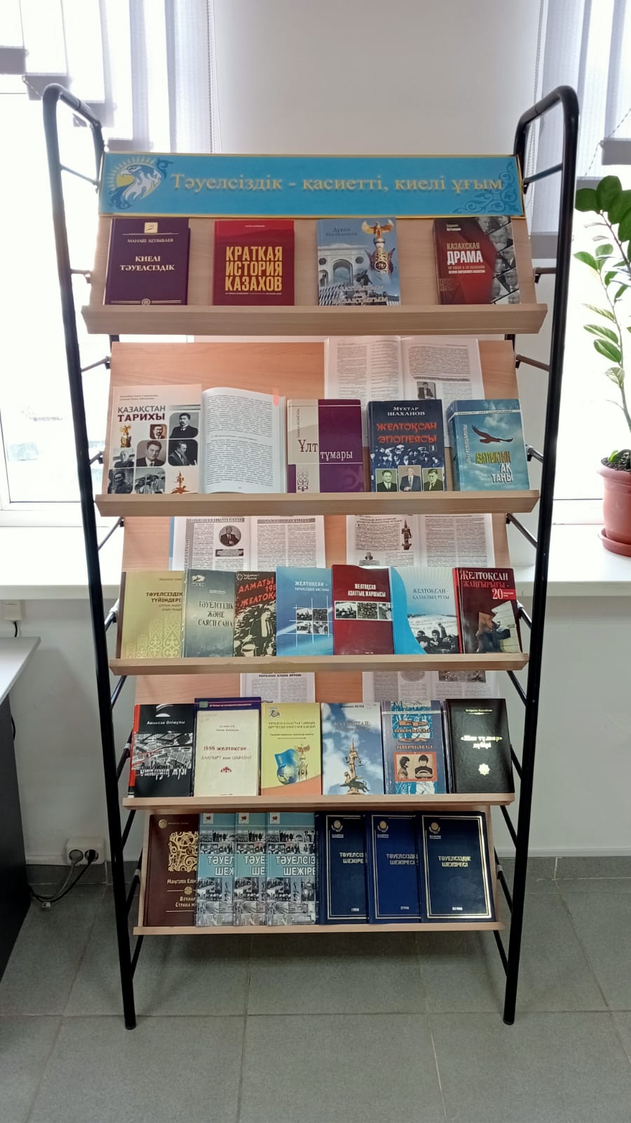 2023 жылғы 13 желтоқсан күні Тәуелсіздік күніне арналған «Тәуелсіздік – қасиетті, киелі ұғым» атты кітап көрмесі ұйымдастырылды. Оқырмандардың назарына «Тәуелсіздік шежіресі» 3 томдық басылым, М. Қозыбаевтың «Киелі тәуелсіздік», С. Акимбековтың «Краткая история казахов», С. Куттыкадамның «Казахская драма на сцене и за кулисами. История современного Казахстана», т.б. басылымдар ұсынылды.