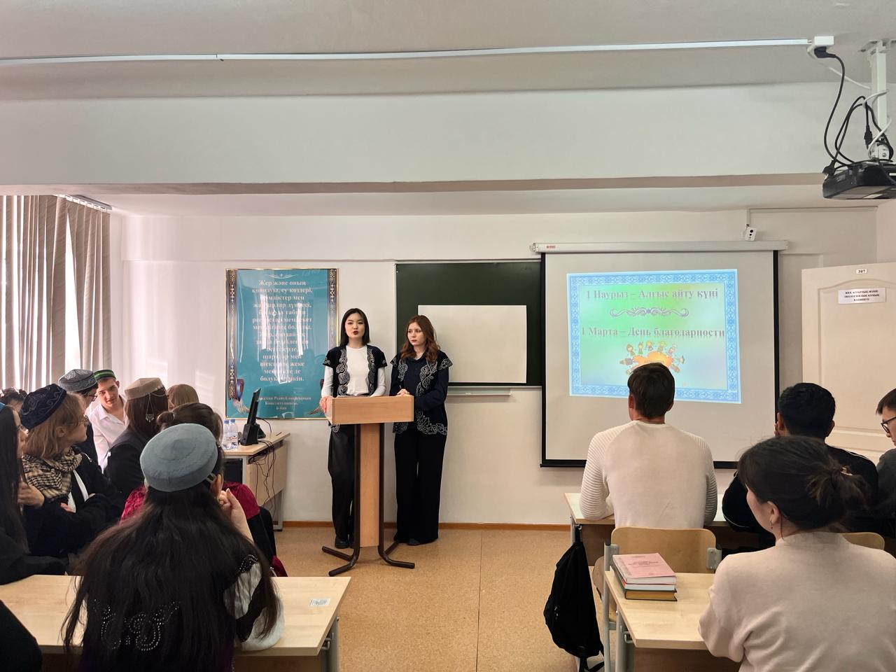 2024 жылғы 29 ақпанда заң пәндері кафедрасында ЮР-23-01, ЮРТ-23-01 (1-курс, «Құқықтану» білім беру бағдарламасы) академиялық топтарының студенттеріне алғыс айту күніне арналған кураторлық сағат өткізілді.