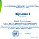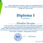 2024 жылғы 11 сәуірде «Шетел тілі: екі шетел тілі» білім беру бағдарламасының 1-2 курс студенттері (ИЯ-23-01, ШТ-22-01, ШТ-22-02 академиялық топтары) Түркіменстан мен шетелдегі жоғары оқу орындарының тілдік және тілдік емес мамандықтары студенттерінің арасында өткен ағылшын тілі бойынша III Халықаралық интернет-олимпиадаға (IIOE-2024) қатысты. Олимпиаданы Довлетмаммеда Азади атындағы Түрікмен ұлттық әлем тілдері институты ұйымдастырды.