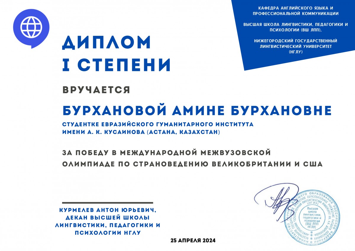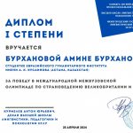 Экономикалық және математикалық пәндер кафедрасының студенті Гульнур Анарбаеваны (Қ-21-01 академиялық тобы) – оңтүстік-батыс мемлекеттік университетінің (Курск қ., Ресей) 60 жылдығына арналған менеджмент саласындағы халықаралық ғылыми жұмыстар байқауында III орынды жеңіп алғанымен құттықтаймыз (ғылыми жетекшісі: э.ғ.м. А.Г. Кожахметова).