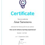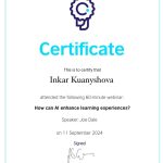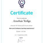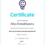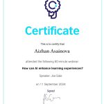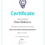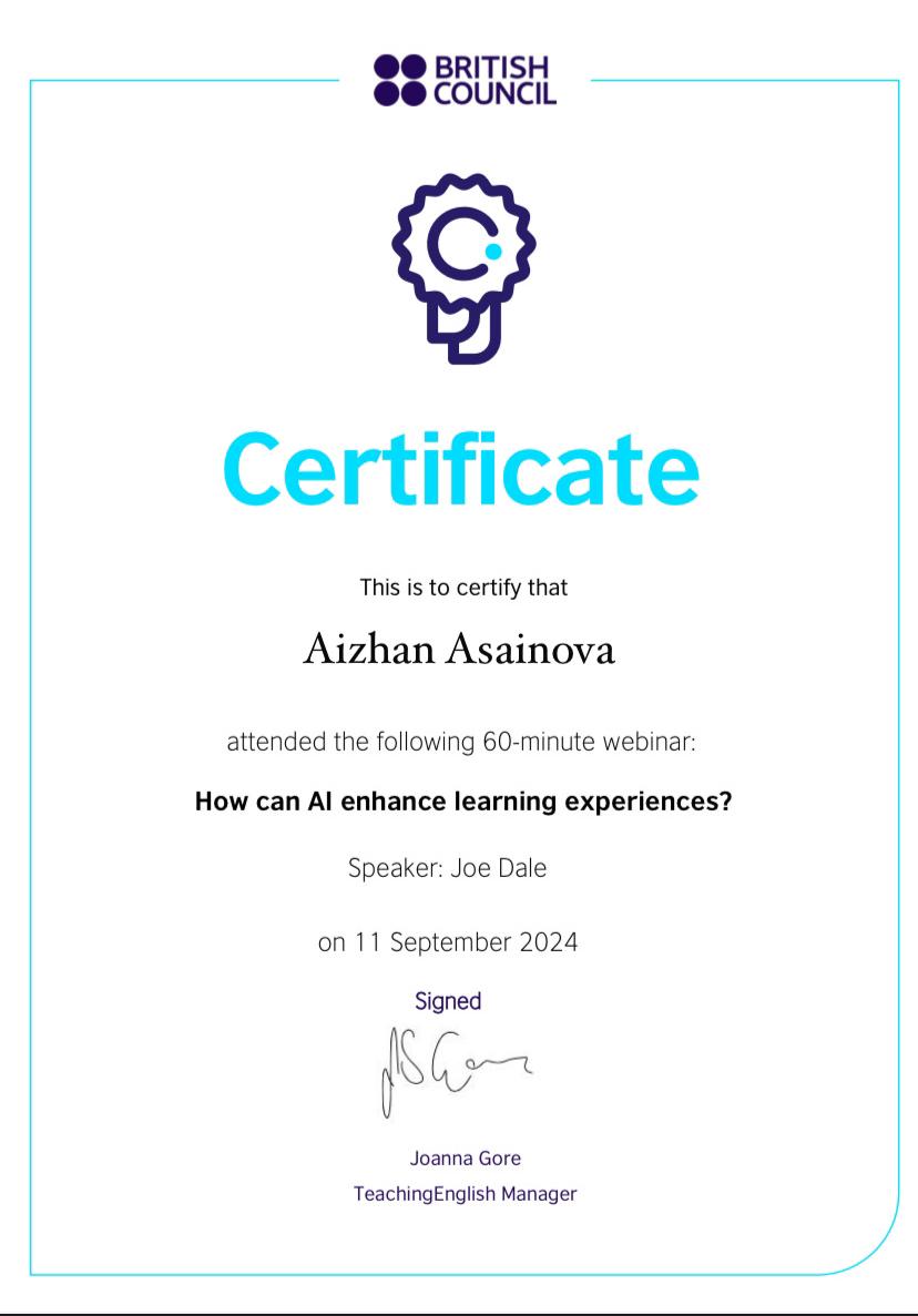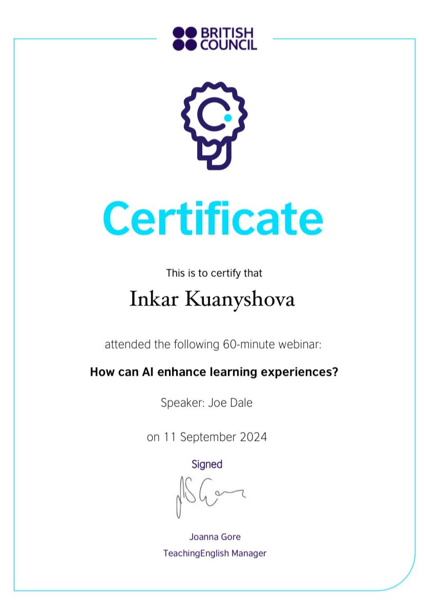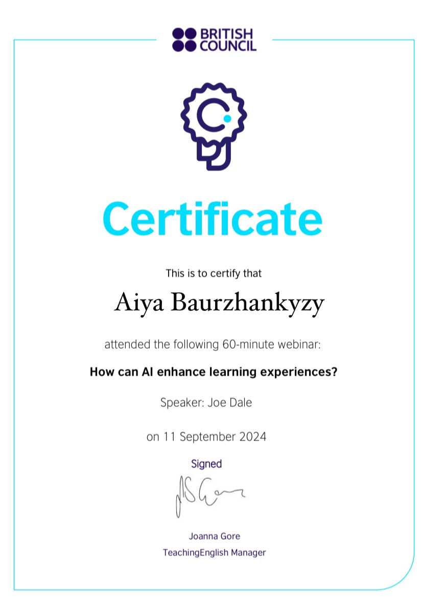 2024 жылғы 11 қыркүйекте ШТ-22-02 академиялық тобының студенттері (3 курс, «Шетел тілі: екі шетел тілі» білім беру бағдарламасы) Британдық кеңес ұйымдастырған «How can AI enhance learning experience» вебинарына қатысып, сертификаттар алды.