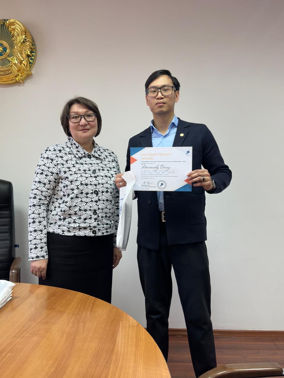 2025 жылғы 13 ақпанда Білім сапасын қамтамасыз ету жөніндегі Тәуелсіз агенттік студент-волонтерлерге қайырымдылық акциясына белсенді қатысқаны үшін IQAA президенті д.п.н., Каланова Ш. М. атынан алғыс хаттарды табыс етті.