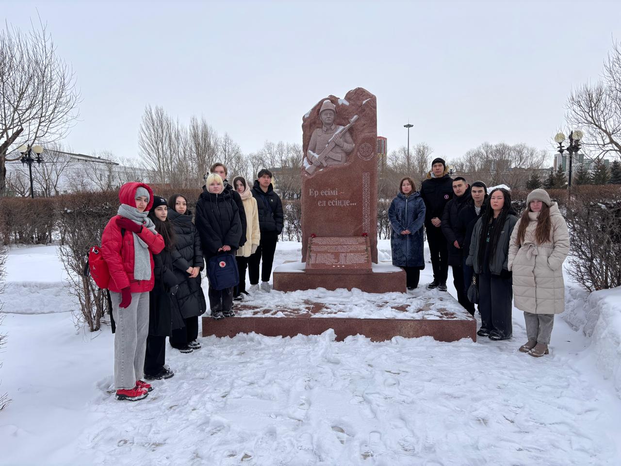 Аға оқытушы Г.А. Канафинаның жетекшілігімен «Құқықтану» білім беру бағдарламасының студенттері (ЮРТ-24-01 және ЮР-22-01 академиялық топтары) олардың құрметіне орнатылған ескерткішті аралады. Гүл қою, бір минут үнсіздік және ризашылық сөздері батырларымыздың батылдығы мен адалдығын құрметтеудің символына айналды.