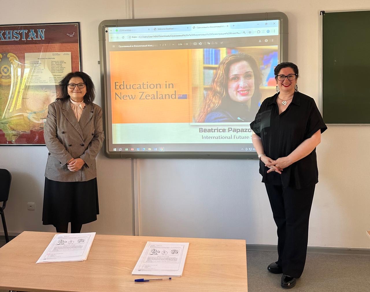 2025 жылғы 26 қыркүйекте Жаңа Зеландиядан келген ағылшын тілі пәнінің оқытушысы Беатрис Папазоглы ИЯ-23-01, ШТ-23-04 академиялық топтарының студенттеріне арналған «Education in New Zealand» тақырыбында дәріс оқыды (3 курс, «Шет тілі: екі шет тілі» білім беру бағдарламасы). Дәріс интерактивті форматта — жанды қарым-қатынас, қызықты тапсырмалар және ағылшын тіліне толық бойлай алатын жағдайда өтті.