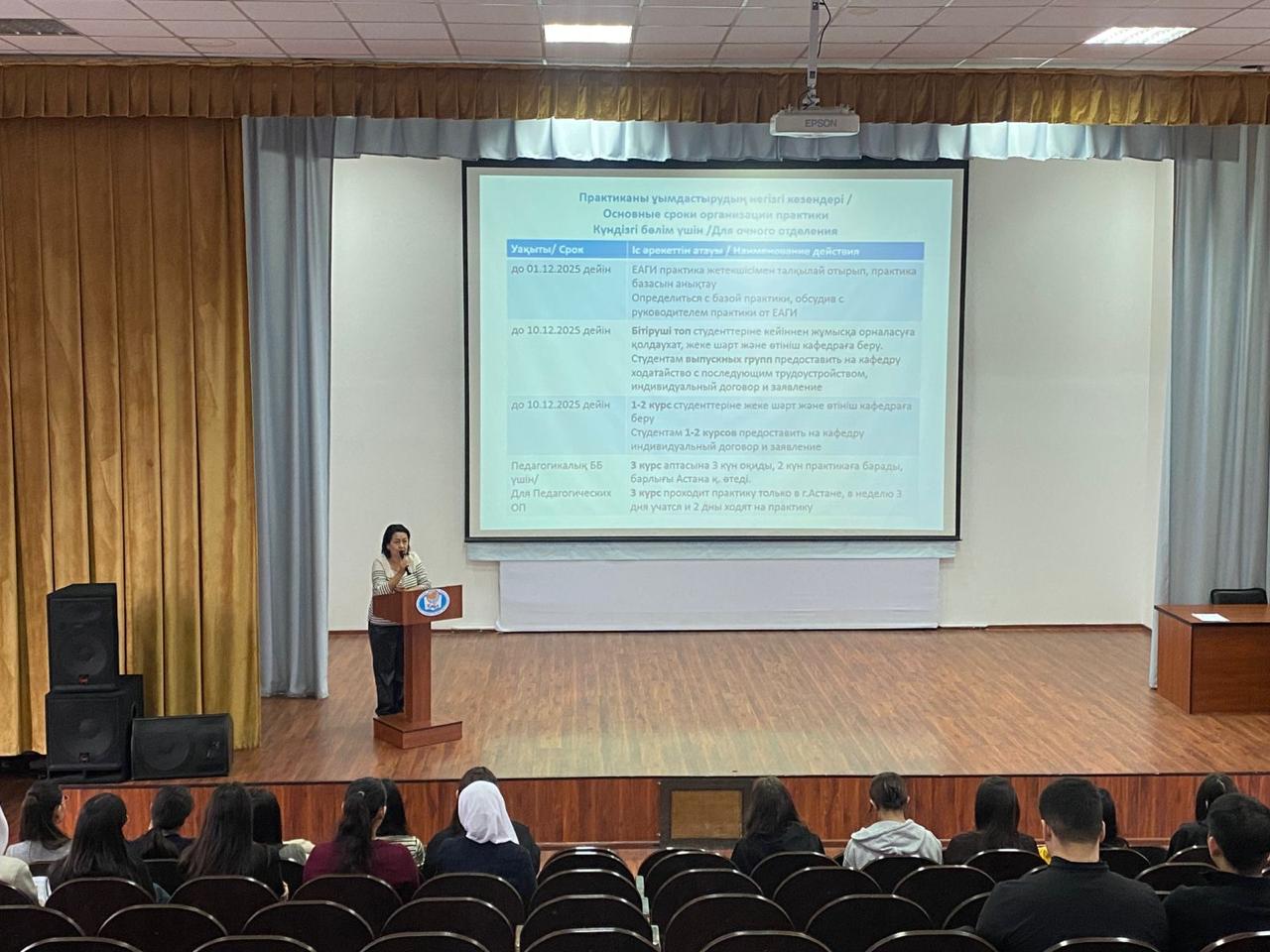 2025 жылғы 26 қарашада Мансап, практика және жұмысқа орналастыру орталығы 2025–2026 оқу жылының бітіруші курс студенттерімен кездесу өткізді. Кездесу барысында өндірістік педагогикалық практиканы өткізу тәртібі, түлектерді бөлу тетіктері және мемлекеттік грантты өтеу мәселелері талқыланды.