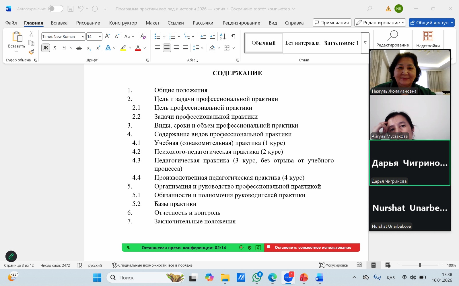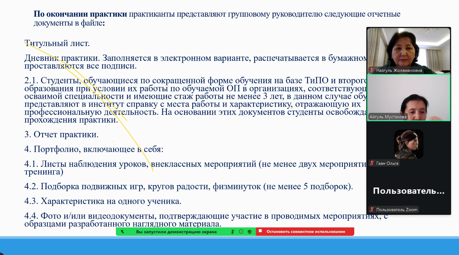 2026 жылғы 16 қаңтарда педагогика және тарих кафедрасының практика бойынша кеңесшілері А.Ж. Мустақова мен Н.Ж. Болатбекова онлайн форматта практикаға бағыт беру мақсатында конференция өткізді.