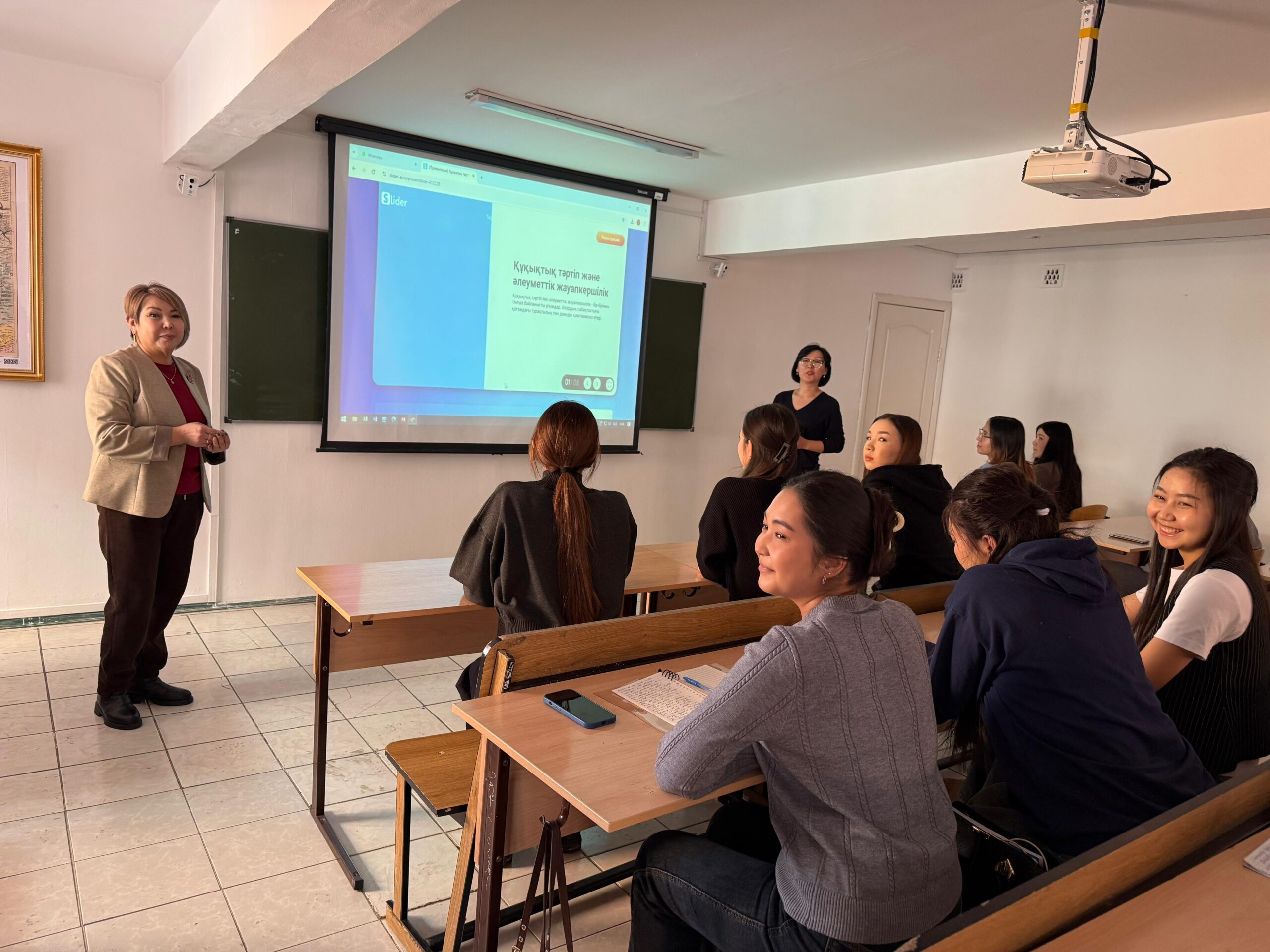 Тәрбиелік және ағартушылық жұмыстар аясында ұйымдастырылған іс-шараның мақсаты – студенттердің құқықтық мәдениетін қалыптастыру және құқықтық нормалардың қоғамдағы тұрақтылық пен азаматтық жауапкершілікті қамтамасыз етудегі маңызын түсіндіру.