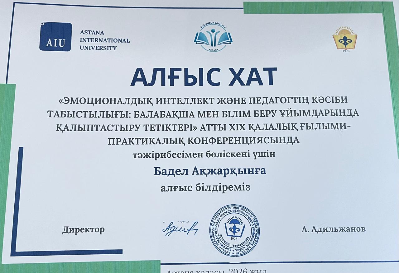 2026 жылғы 12 ақпанда Астана Халықаралық университетінің жоғары Педагогикалық колледжінде «Эмоционалдық интеллект және педагогтің кәсіби табыстылығы: балабақша мен оқу орнында қалыптастыру тетіктері» тақырыбында XІX қалалық ғылыми-практикалық конференция өтті.