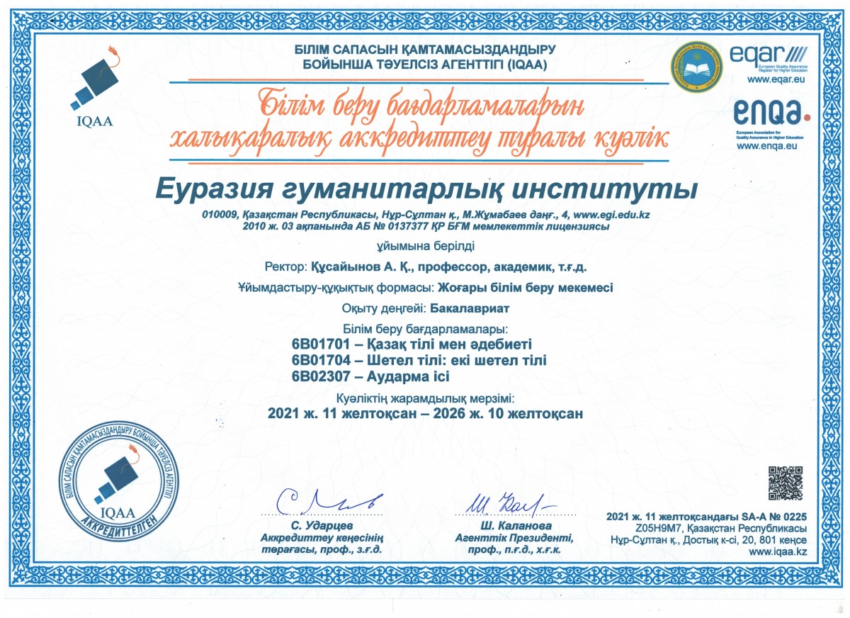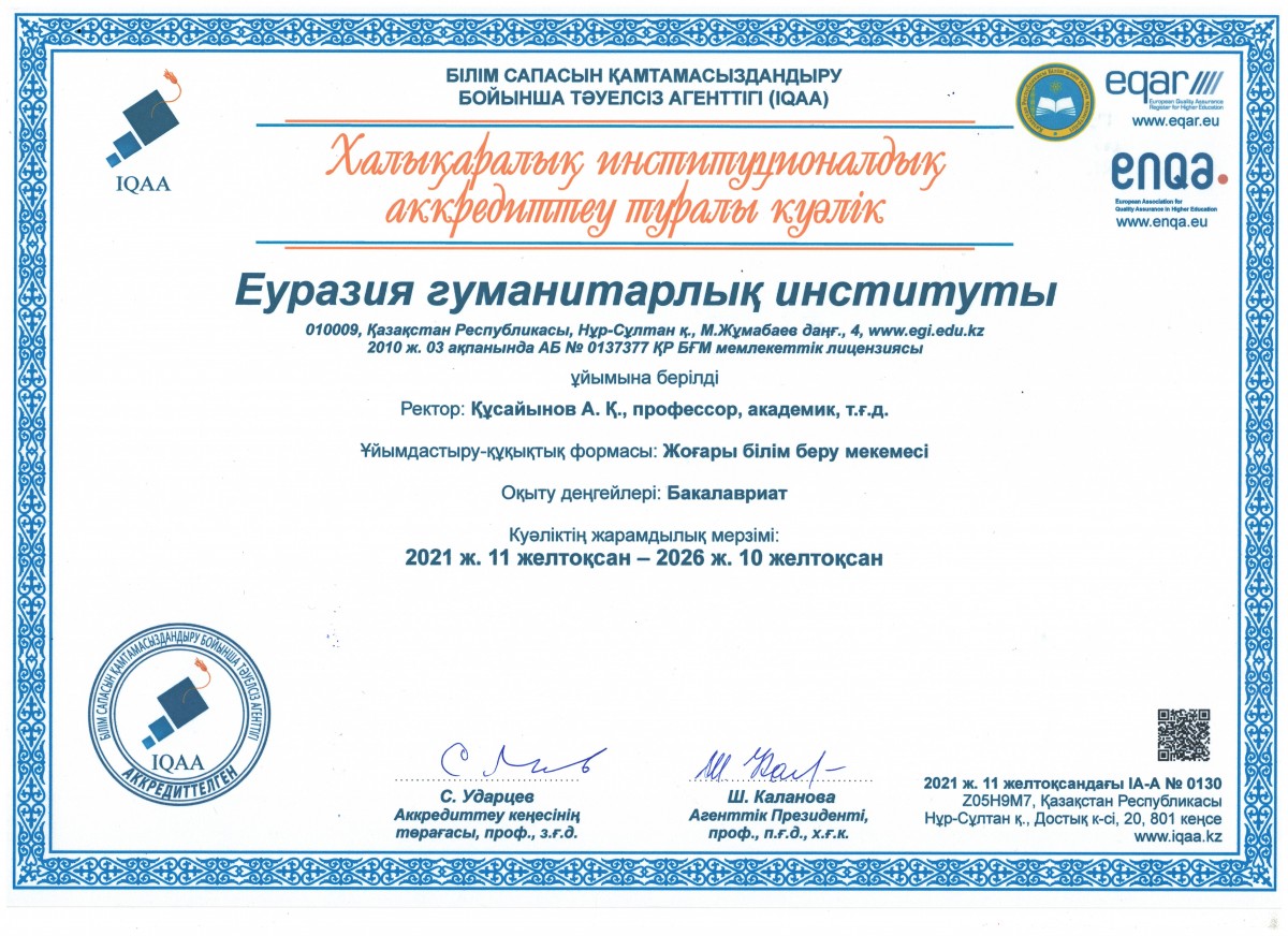 Білім беру сапасын қамтамасыз ету жөніндегі Тәуелсіз агенттіктің (IQAA) Аккредиттеу Кеңесі отырысының 2021 жылғы 11 желтоқсандағы шешімімен Еуразия гуманитарлық институты институционалдық және бағдарламалық аккредиттеуден 5 жыл мерзімге өтті деп танылды.