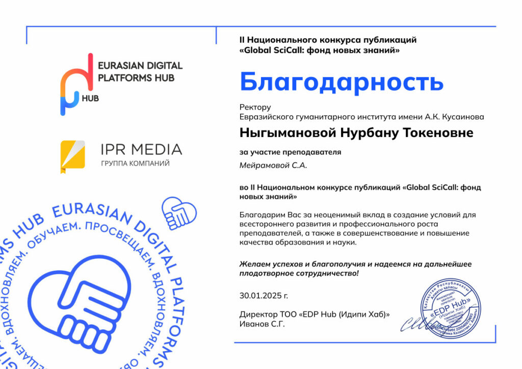 ЖаңалықтарА. Қ. Құсайынов атындағы Еуразия гуманитарлық институтының ректоры Ныгыманова Нурбану Токеновнаға алғыс білдіреді Модератор-1 Сайта / 10.02.2025
