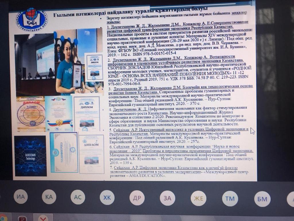Коллектив Евразийского гуманитарного института поздравляет команду специальности «Финансы» в составе: Сейдіхан Альмиры, Жалмышевой Дайаны, Көпжасар Анели, занявшую ІІІ место в Международном конкурсе студенческих научных проектов «Модернизация финансово-кредитной системы Казахстана в условиях новой реальности», проходившей на базе Евразийского национального университета имени Л.Н. Гумилева 9 ноября 2020 года. Руководитель команды – старший преподаватель, магистр Даулетханова Жанар Дәулетханқызы. Желаем новых побед!
