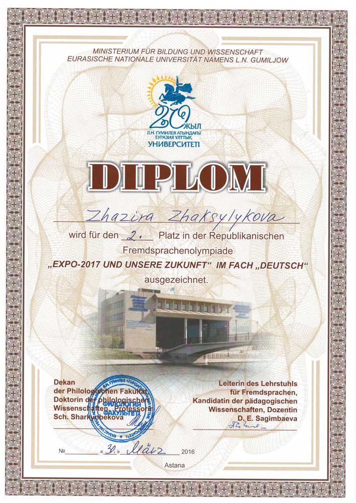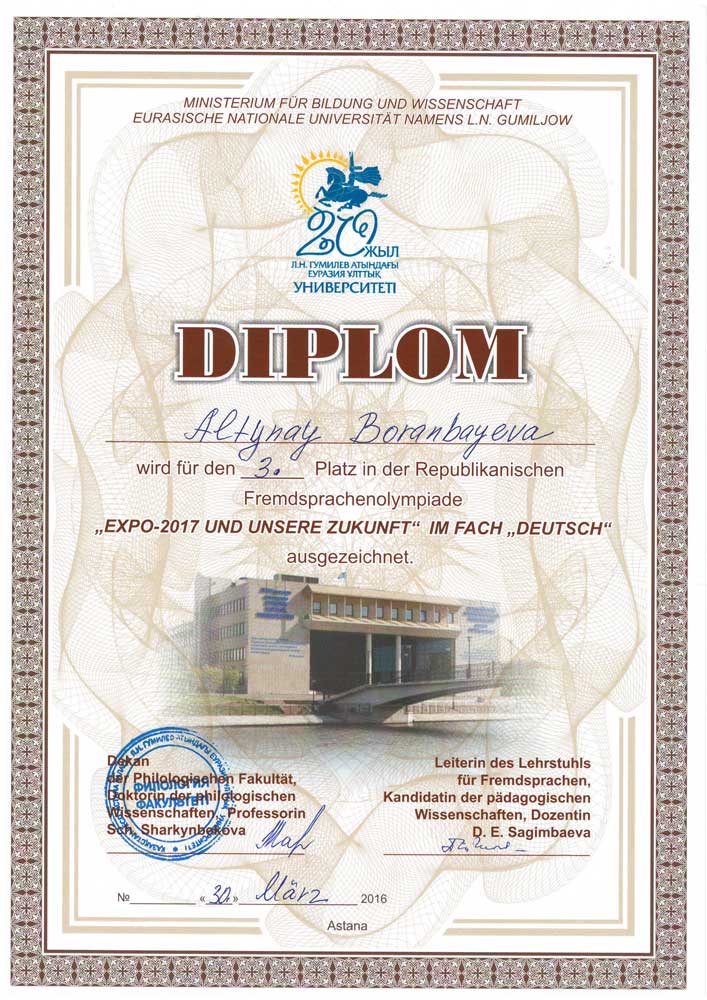 30 марта 2016 года в ЕНУ им. Л.Н. Гумилева состоялась республиканская студенческая олимпиада по немецкому языку среди студентов неязыковых специальностей и специальностей «Иностранный язык: два иностранных языка» и «Переводческое дело», изучающих немецкий как второй иностранный язык. Данное мероприятие было организовано кафедрой иностранных языков филологического факультета в рамках празднования 20 – летия ЕНУ им. Л.Н. Гумилева. В олимпиаде участвовали студенты, владеющие немецким языком на уровне А1-В1. Олимпиада включала в себя три тура:
