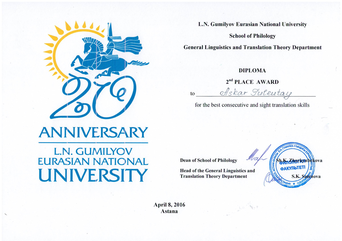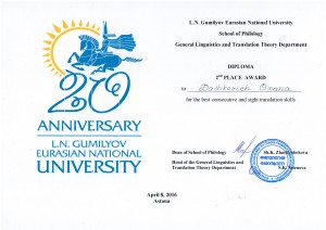 Поздравляем Дашкевич Оксану занявшую 2 место (студентку группы ПДС-14-01), Тулеутай Аскара занявшего 2 место (студента группы ПДС-14-01), Сулейменова Олжаса занявшего 3 место (студента группы ПД-3-18) по итогам межвузовской студенческой олимпиады по специальности «Переводческое дело», состоявшейся на базе Евразийского национального университета имени Л.Н.Гумилева.
