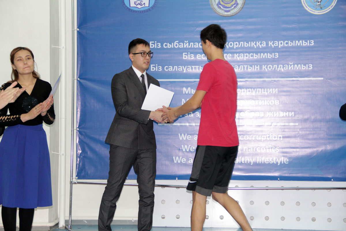 В турнире по баскетболу в упорной борьбе кубок за 1 место завоевала команда кафедры иностранных языков, 2-ое и 3-е места заняли соответственно команды кафедры экономических и математических дисциплин и государственно- правовых дисциплин. Команда группы ЮК-14 кафедры государственно- правовых дисциплин была удостоена диплома «За волю к победе». Лучшими игроками турнира по баскетболу были признаны Жанбаев Евгений, Саян Мольдир, Салимжанов Еркебулан. Победители и лучшие игроки турнира были награждены дипломами и ценными призами.