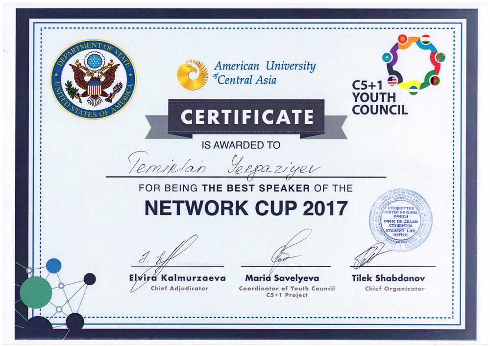 Американский университет в Центральной Азии при поддержке посольства США в Кыргызской Республике в рамках проекта Youth Council C5+1 провел международный турнир по дебатам “Network Cup 2017”. Дебатный турнир проходил 27-29 января. Участие принимали 2 языковые лиги: Русская, Английская. Студент кафедры иностранных языков группы ПД 14-01 Ергазиев Темирлан принял участие в английской лиге, в которой участвовало 24 команды. В командном зачете команда Темирлана стала финалистом турнира и самой эффективной командой отборочных раундов. В индивидуальном зачете наш студент стал лучшим спикером. Мероприятие призвано объединить прогрессивную молодёжь Центральной Азии для обсуждения острых проблем регионального и международного уровня. Турнир также нацелен на укрепление взаимоотношений и создание эффективных коммуникативных площадок для будущих лидеров.