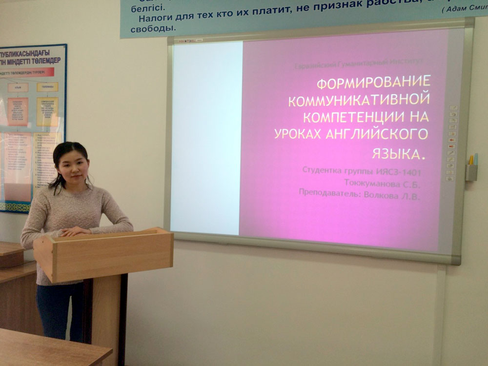 «Мне, как учителю английского языка младших классов, элективный курс «Формирование коммуникативной компетенции преподавателя английского языка» очень полезен для совершенствования своих профессиональных навыков, поскольку обогащение знаниями для формирования вторичной языковой личности является приоритетным в наше время» – Токжуманова Самал , студент группы ИЯСз – 14-01, учитель английского языка СШ № 41 аула Кабанбай батыра Целиноградского района.