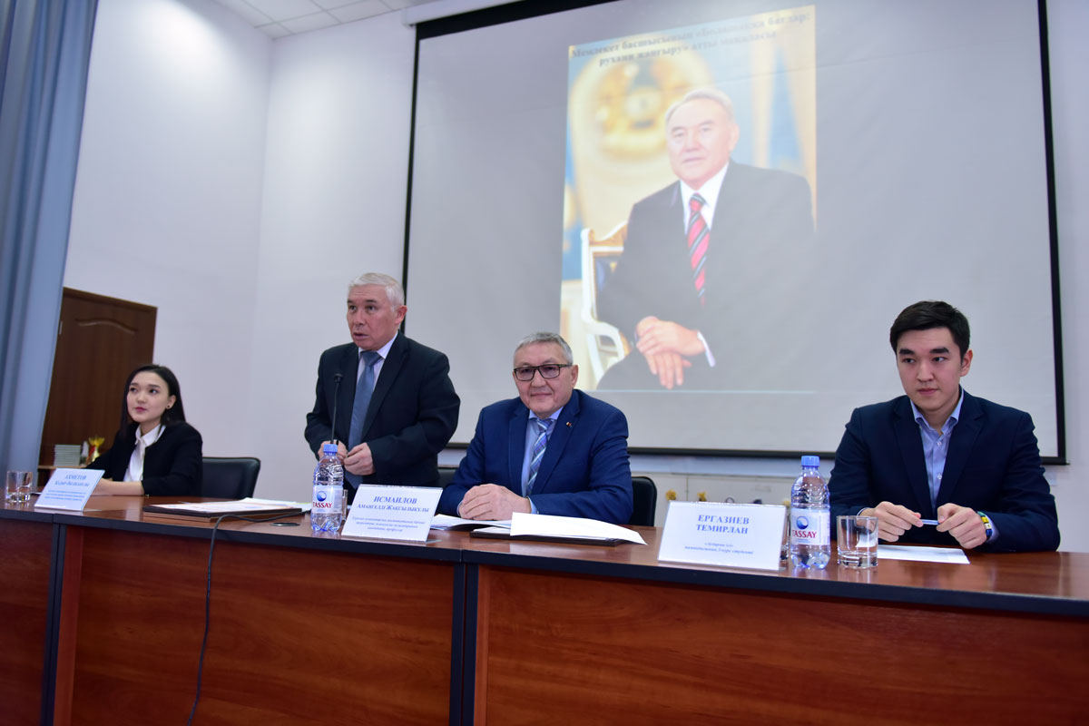 Проректор К.А. Ахметов, выступая перед присутствующими, остановился на главных ориентирах статьи Главы государства: мир начинает новый исторический цикл. Поэтому важно сконцентрироваться и адаптироваться к новым условиям, взяв лучшее из того, что несет в себе новая эпоха. Развиваться и достигать тех поставленных задач в экономике, о которых пишет Президент, а самое главное, конечно же, войти в число высокоразвитых прогрессивных стран современного мира. А это возможно только в том обществе, где духовные ценности и приоритеты будут правильно и корректно расставлены.
