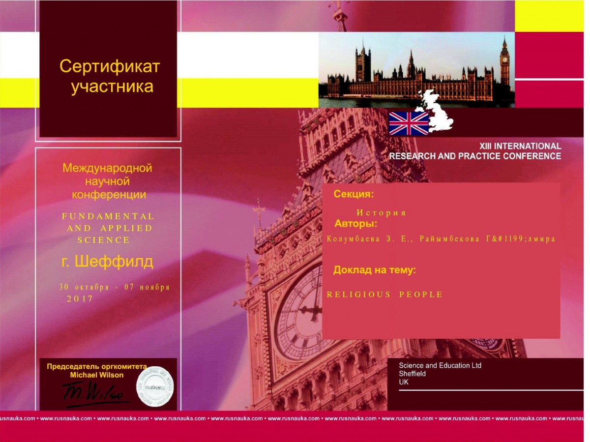 В октябре текущего года в г. Шеффилд (Великобритания) состоялась международная научно-практическая конференция «Фундаментальная и прикладная наука», в которой приняла участие старший преподаватель кафедры казахской и русской филологии, магистр педагогических наук Райнбекова Гульмира Сайлаубаевна.