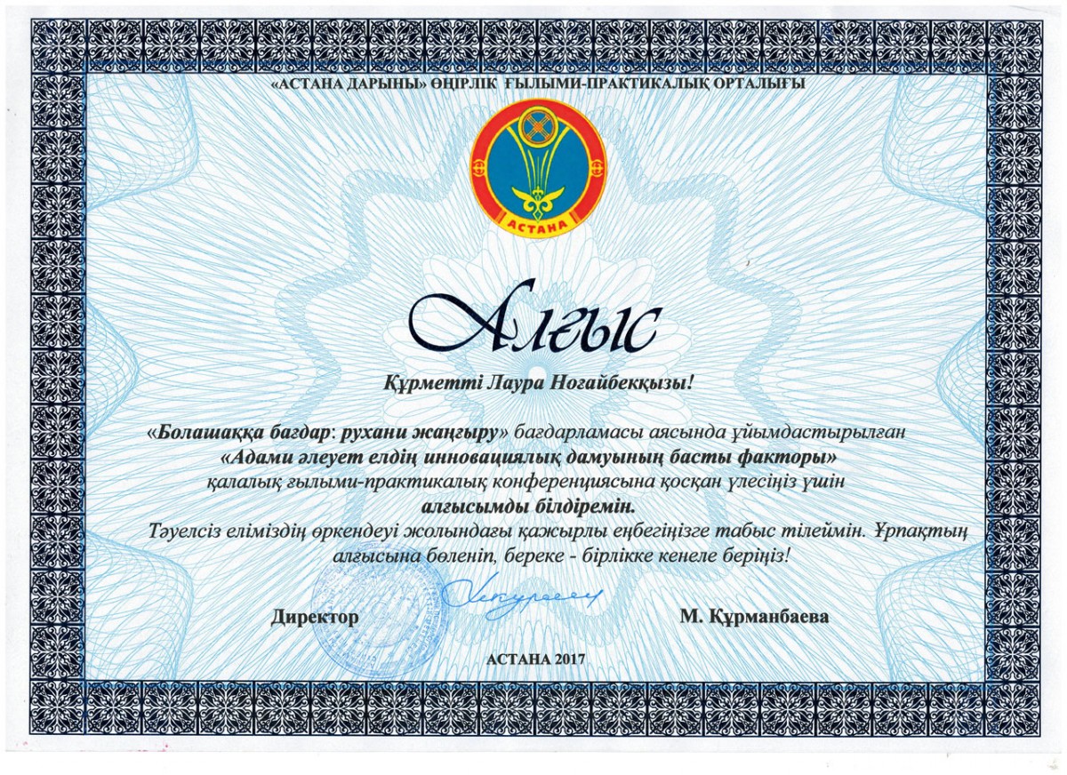 Кандидат филологических наук, доцент кафедры казахской и русской филологии Л.Н. Дауренбекова награждена благодарственным письмом от директора Регионального научно-практического центра «Астана дарыны» за активное участие в качестве модератора в составе президиума городского научно-практического конкурса-конференции «Человеческое общество – главный фактор инновационного развития страны», проводимый в рамках программы «Взгляд в будущее: духовное обновление».