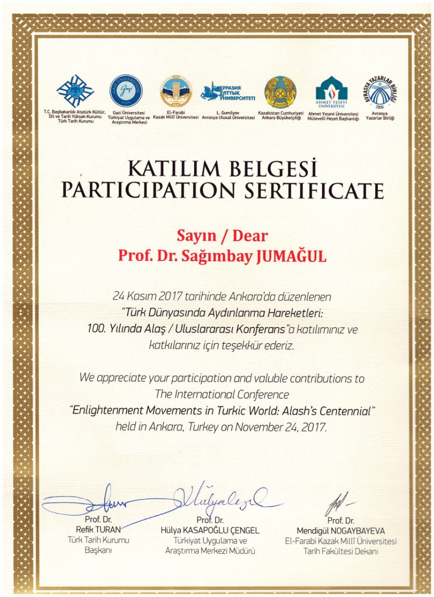 Профессор кафедры казахской и русской филологии Сагимбай Ботпаевич Жумагулов выступил с докладом «Стихотворения о партии Алаш» на Международной научной конференции, посвященной 100-летию правительства Алашорды. Данное мероприятие, организованное Университетом Гази, проходило в Анкаре в октябре текущего года.